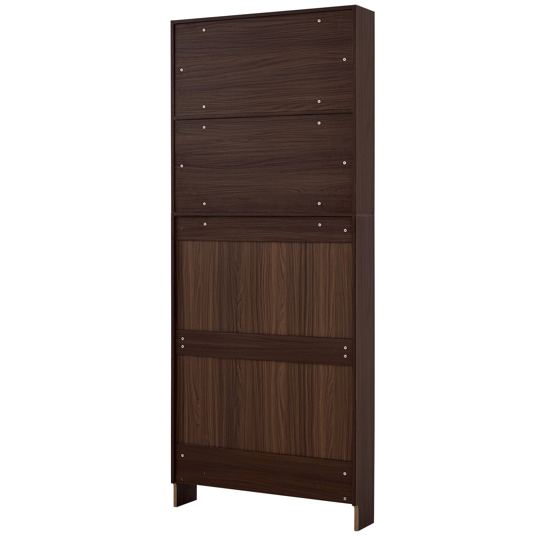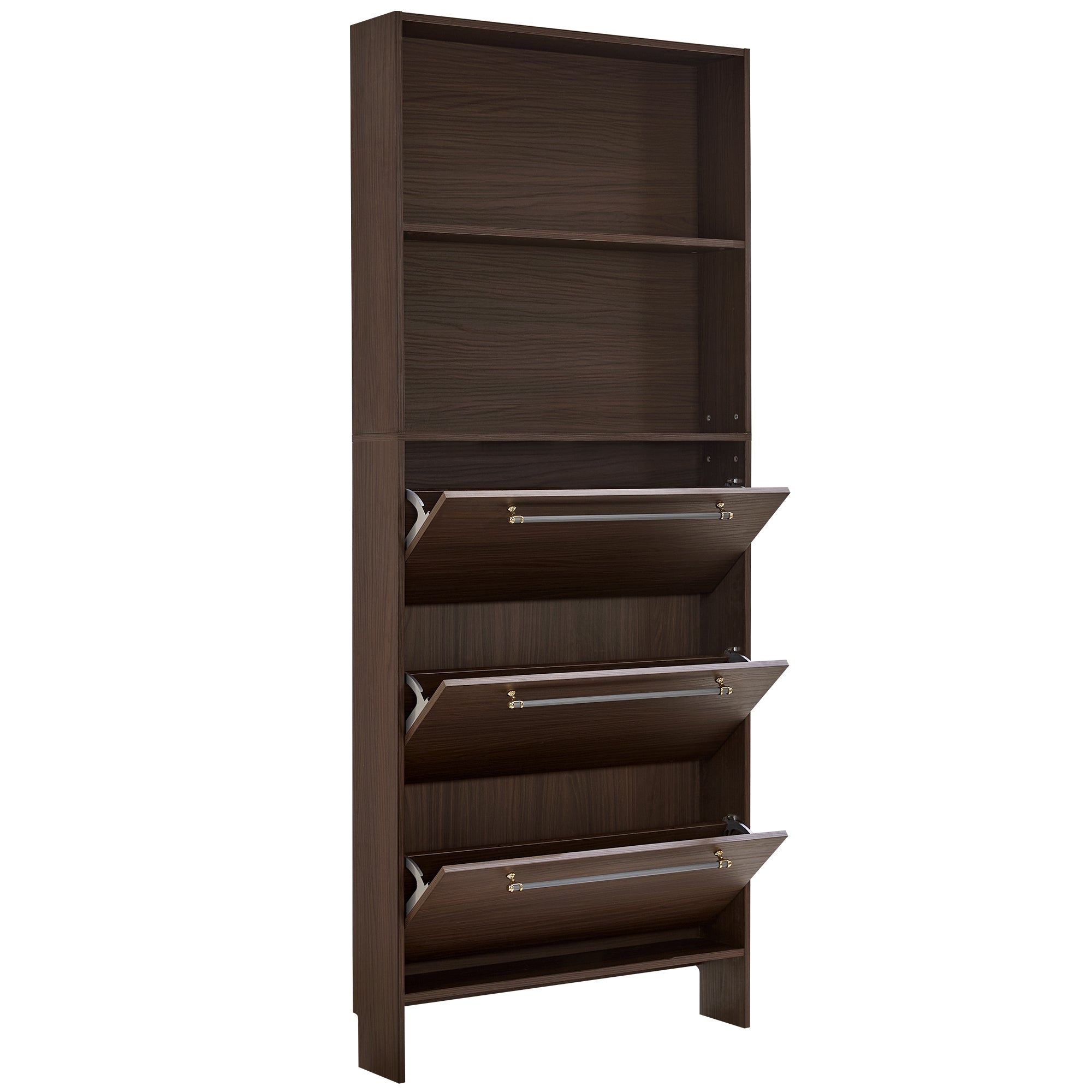 Upgrade your entryway with a slim, stylish shoe storage solution that keeps footwear organized and everyday essentials within reach. This tall, narrow cabinet combines concealed flip-drawer shoe storage with open top shelves and hooks for quick-access items, making it ideal for hallways, porches, and living areas where space is at a premium. Constructed from P2-grade MDF with a textured walnut finish and metal handles, it balances durability with a modern farmhouse aesthetic.