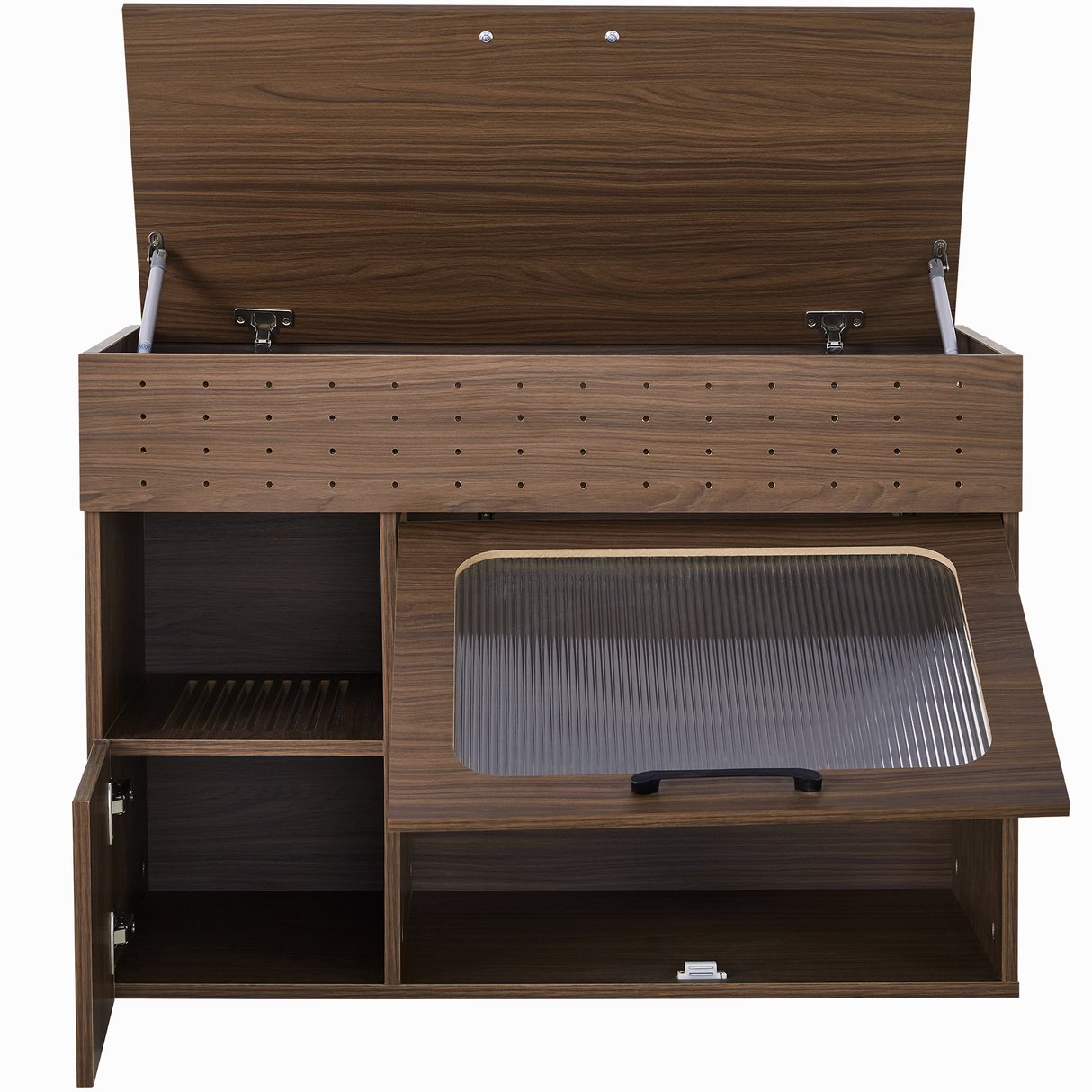 - Design Features: Featuring a sleek and modern design, the side table's walnut finish adds a touch of elegance to any room. The perforated detailing on the top drawer not only adds an aesthetic element but also promotes air circulation. The integrated cat - litter box compartment is cleverly hidden behind a door with a stylish, ribbed - glass - like panel, maintaining the table's overall aesthetic while providing privacy for your cat.