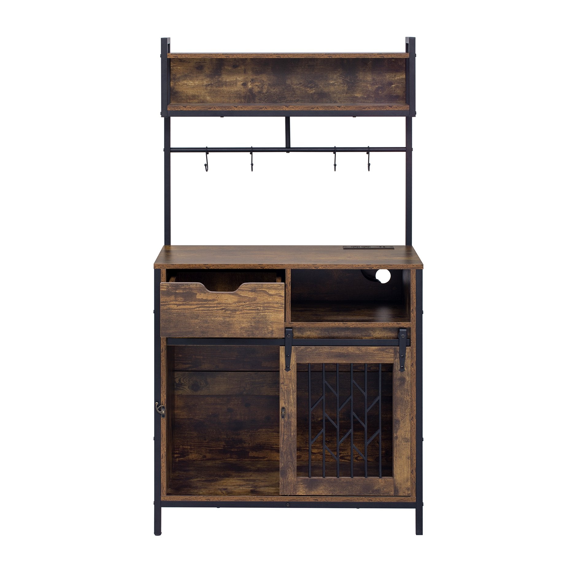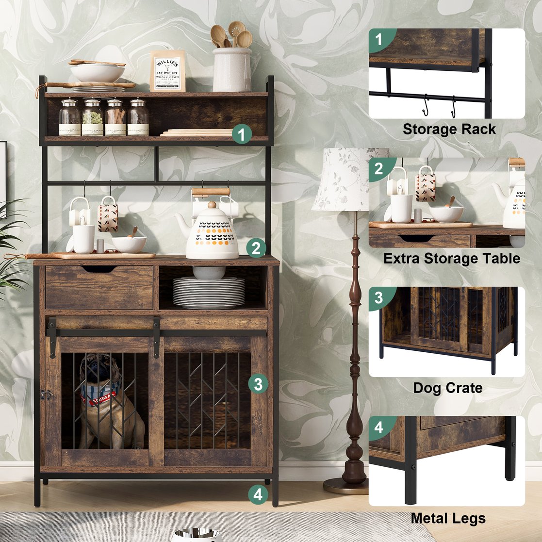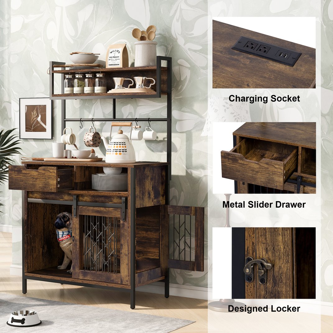 - Design & Aesthetic Appeal: Featuring a rustic - industrial design, this hutch combines the warmth of wood with the edginess of metal. The dark wood finish and metal frame create a visually appealing contrast, adding a touch of charm to any home decor. The sliding doors with metal grilles for the dog area not only ensure ventilation but also add a stylish element. The open shelves and hanging rod above the countertop allow for easy display and access to your favorite kitchen items.