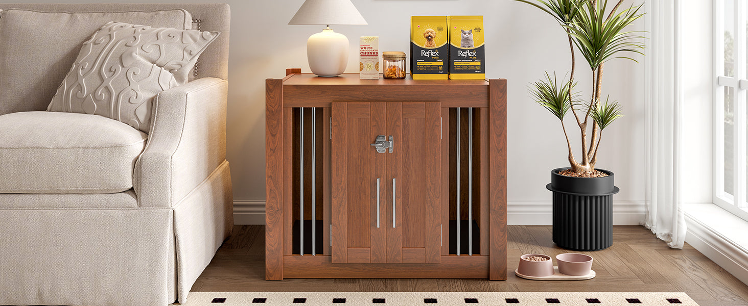 A stylish and multifunctional piece that blends mid-century modern design with practical pet-friendly features, this walnut-finish side table doubles as a dog crate and an end-of-bed bench. Smooth lines and a removable, easy-clean cushion make it ideal for living rooms, bedrooms, or entryways where both human seating and a secure pet space are needed. Built to be sturdy and low-maintenance, it offers hidden storage, a lockable crate area, and a compact footprint that complements contemporary interiors.