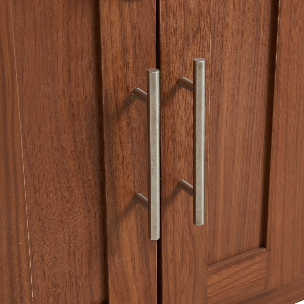 - Materials & Finish: Constructed from particle board and MDF with a walnut finish; wipe spills immediately with a damp cloth and avoid harsh surface cleaners to protect the finish.