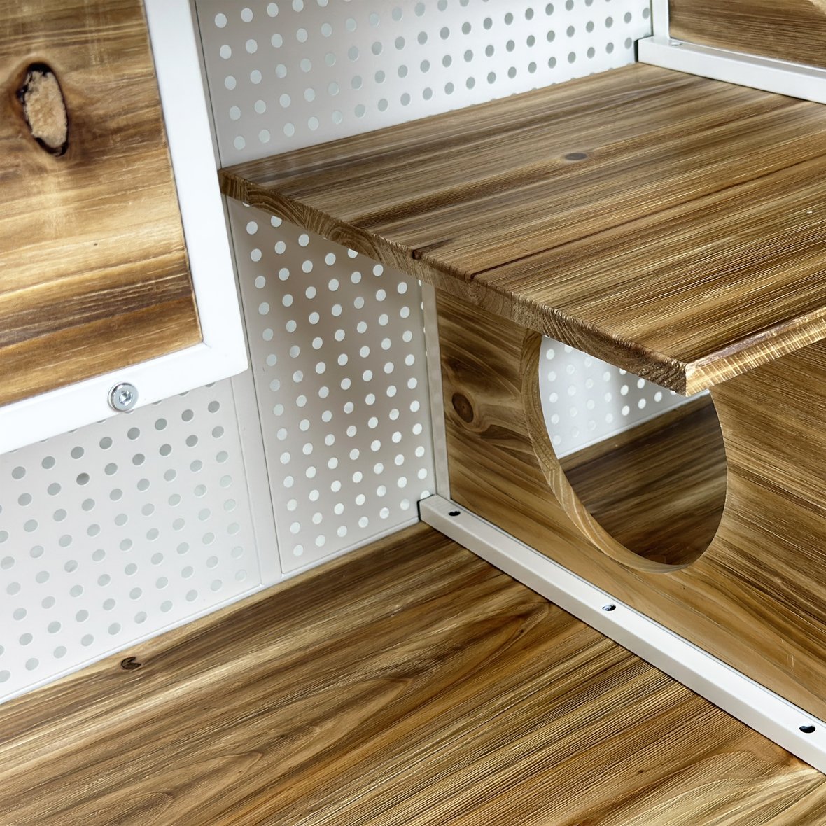 - Spacious activity space: This cat house has enough internal space for cats to chase and run inside. A litter basin can be placed on the left side of the cat house, making it convenient for cats to use the washroom. The interior of the cat house is equipped with shelves inside, suitable for cats to rest and play.
