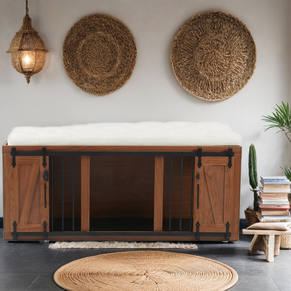 Give your home a stylish, multi-functional upgrade with this furniture-style 2-in-1 dog crate and bench ottoman. Designed in a mid-century modern walnut finish, it combines a secure, roomy kennel for your pet with a comfortable padded seat and useful storage/bench functionality—perfect for the end of a bed, entryway, or living room. Crafted from durable engineered woods and metal hardware, the piece balances pet safety, everyday practicality, and refined home décor.