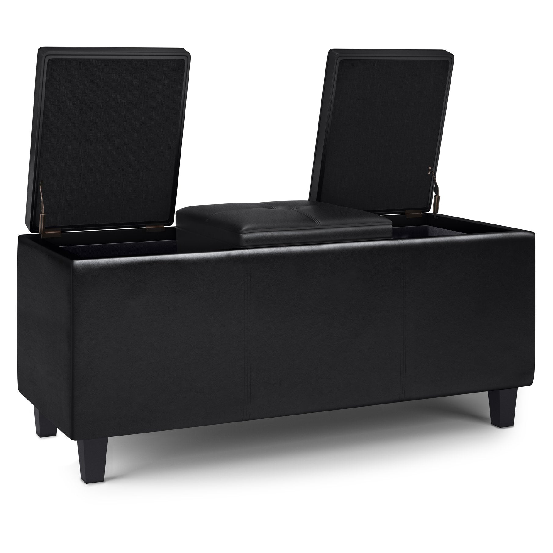 Add refined storage and serving functionality to your living space with this contemporary Midnight Black storage ottoman. Upholstered in rich vegan faux leather with tufted detailing and contrast stitching, it combines elegant styling with practical features—perfect as a coffee table alternative, extra seating, or a hidden storage solution for living rooms, family rooms, condos, or bedrooms.