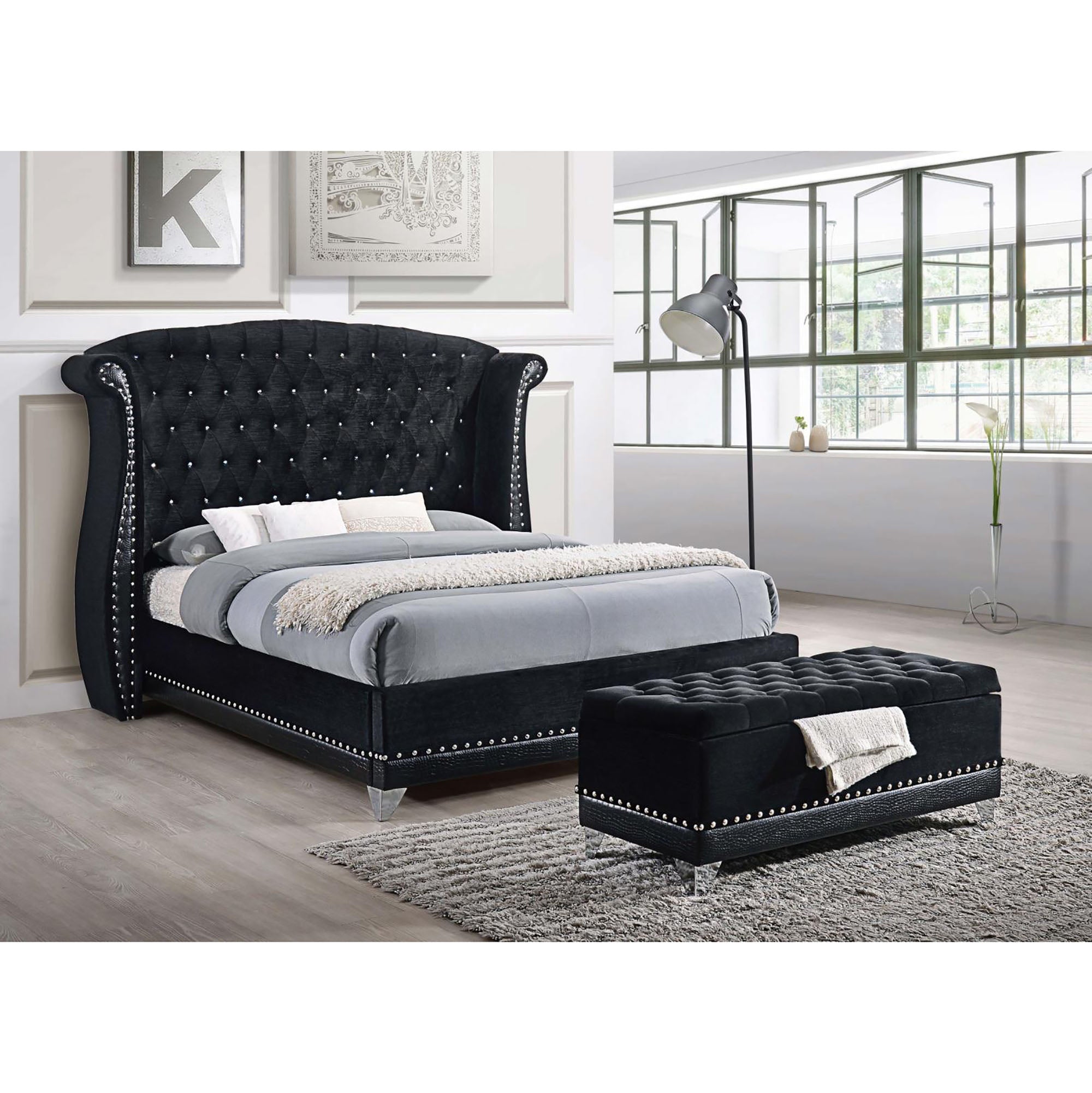 Add a bold, glamorous focal point to your room with this black tufted storage trunk. Upholstered in a soft, velvety finish and trimmed with polished nickel nailheads, it blends glamorous style with practical storage—perfect at the foot of a bed, in an entryway, or as extra seating in a living area. The plated mirror legs and tufted cushion provide sparkle and comfort, while the roomy interior keeps blankets, pillows, or seasonal items neatly out of sight.