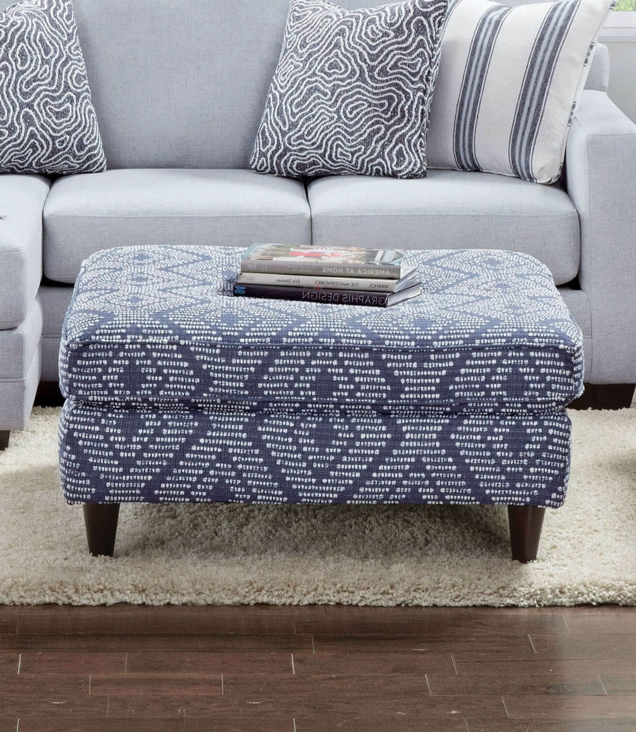 Refresh your living area with this contemporary ottoman that blends bold patterning and a rich blue finish for a modern, inviting look. Built with tapered block legs in an espresso finish, it serves as a versatile centerpiece—use it as extra seating, a footrest, or a low-profile coffee table with a tray. The patterned upholstery adds visual interest while the clean lines keep the overall aesthetic refined and adaptable to many decor styles.