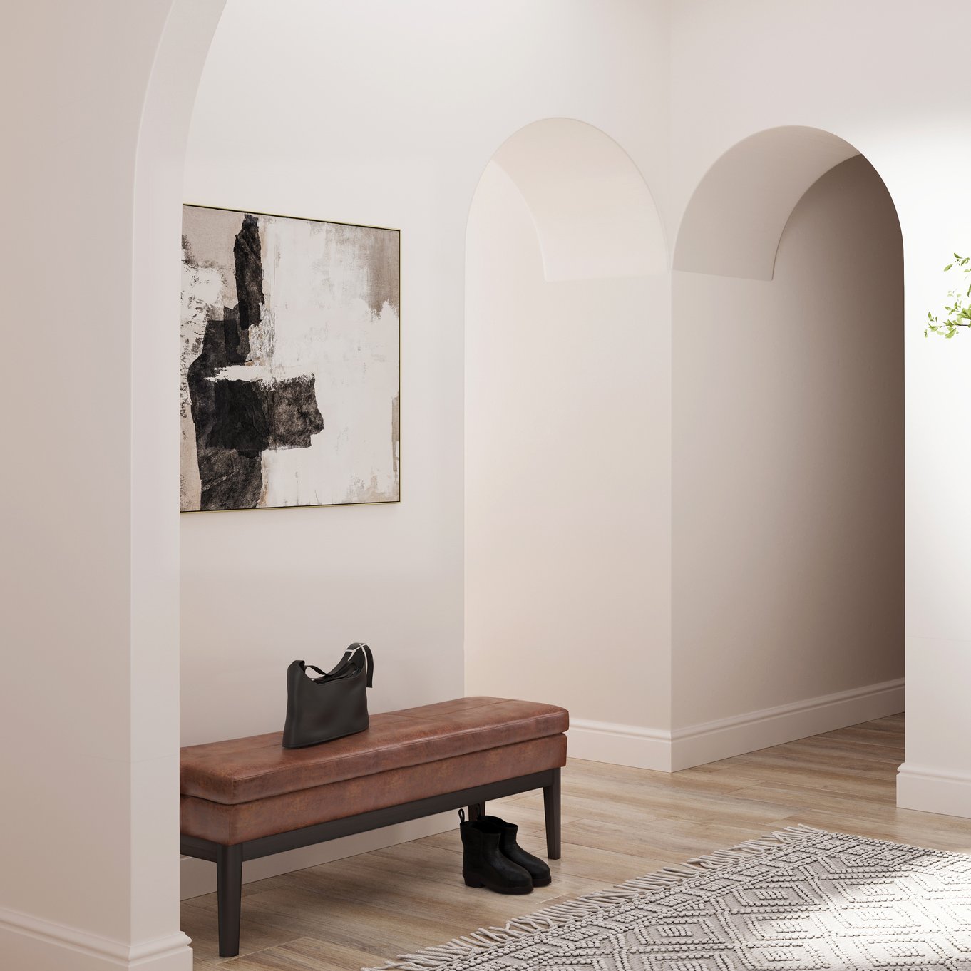 Elevate your living space with the Carlson Ottoman Bench, a versatile and stylish piece that blends mid-century design with everyday functionality. Upholstered in distressed saddle brown faux leather, this hand-constructed bench offers comfortable seating, durable construction, and clean lines that work well as an entryway bench, extra seating in a living room, or a footrest at the end of a bed.