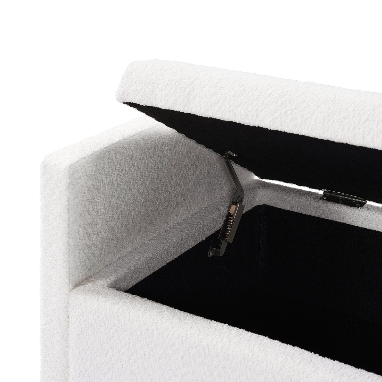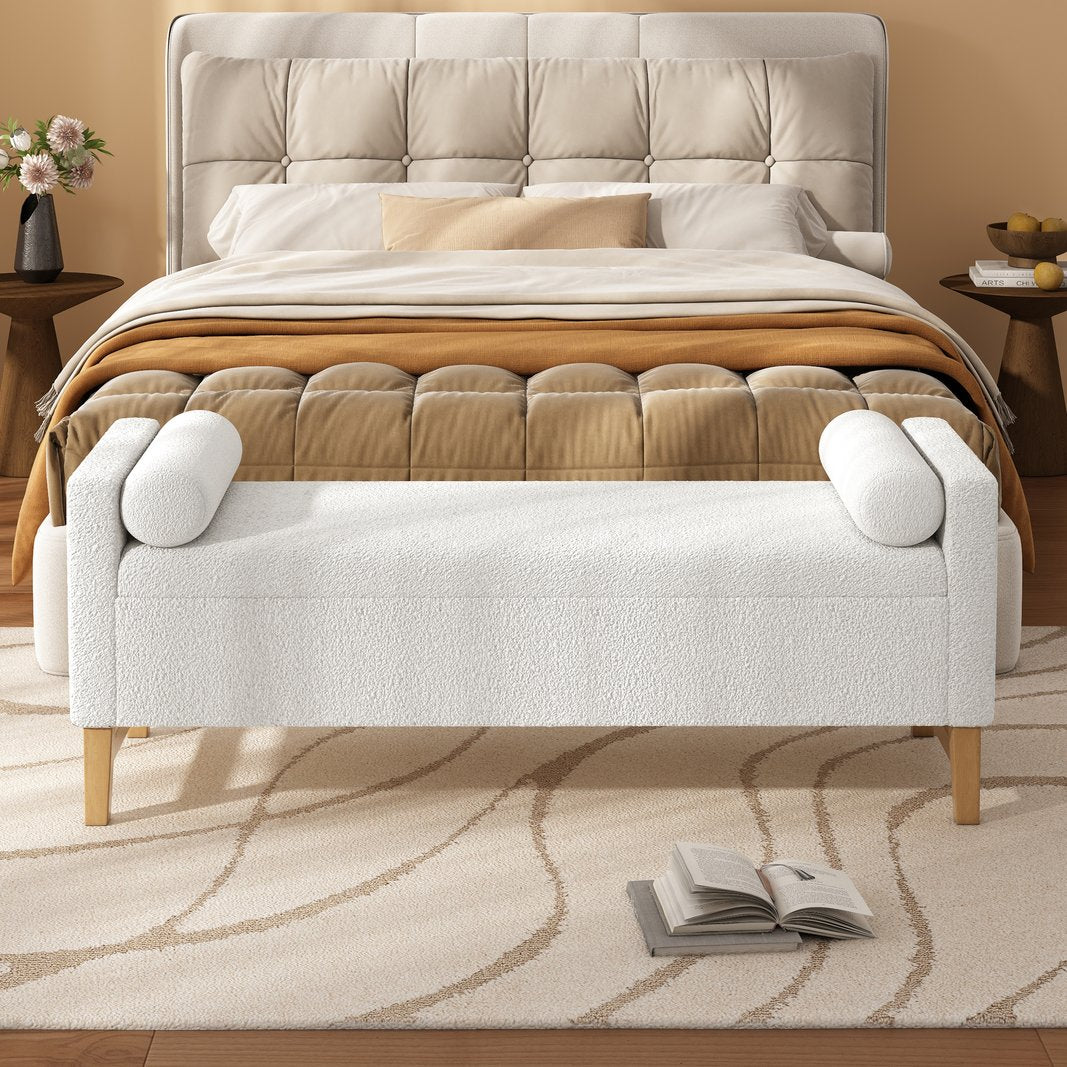 Add refined texture and practical storage to your living space with this ivory boucle upholstered storage ottoman. Designed to blend modern elegance with everyday functionality, it offers a comfortable seat, hidden storage for clutter-free rooms, and solid wood support for lasting use. The neutral ivory boucle finish and included round pillows make it an adaptable accent for bedrooms, living rooms, entryways, or dining areas.