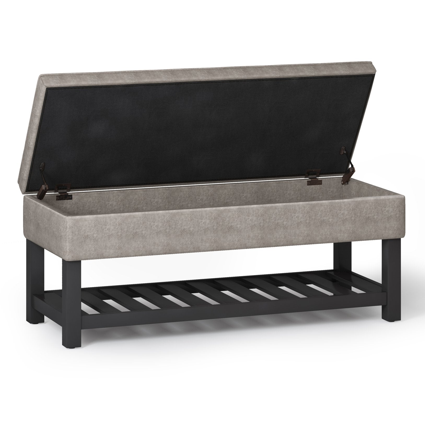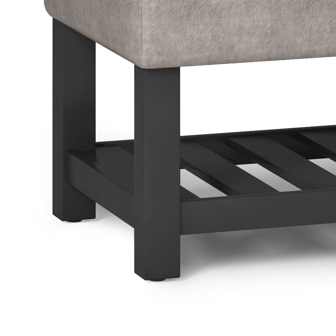Add a touch of modern-transitional style and practical storage to your home with this Cosmopolitan storage ottoman bench. Upholstered in distressed grey-taupe vegan faux leather and detailed with tufting, it offers comfortable seating, a lift-up storage compartment with a child-safety hinge, and an open slat bottom shelf—ideal for entryways, bedrooms, living rooms, or hallways where both form and function matter.