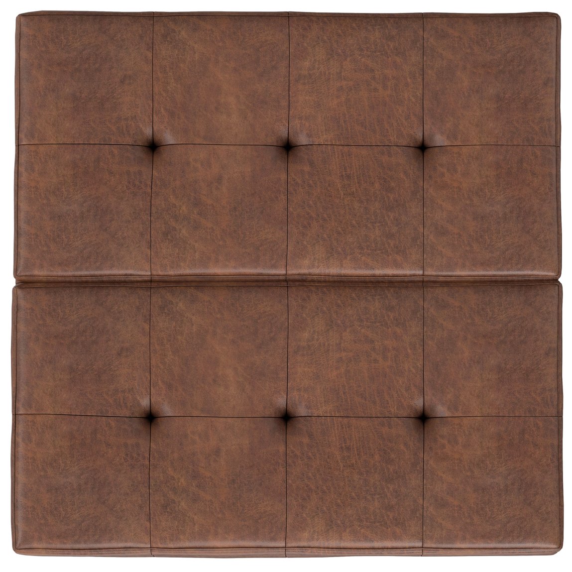 - Upholstered in a Distressed Saddle Brown Vegan Faux Leather with square tufting.
