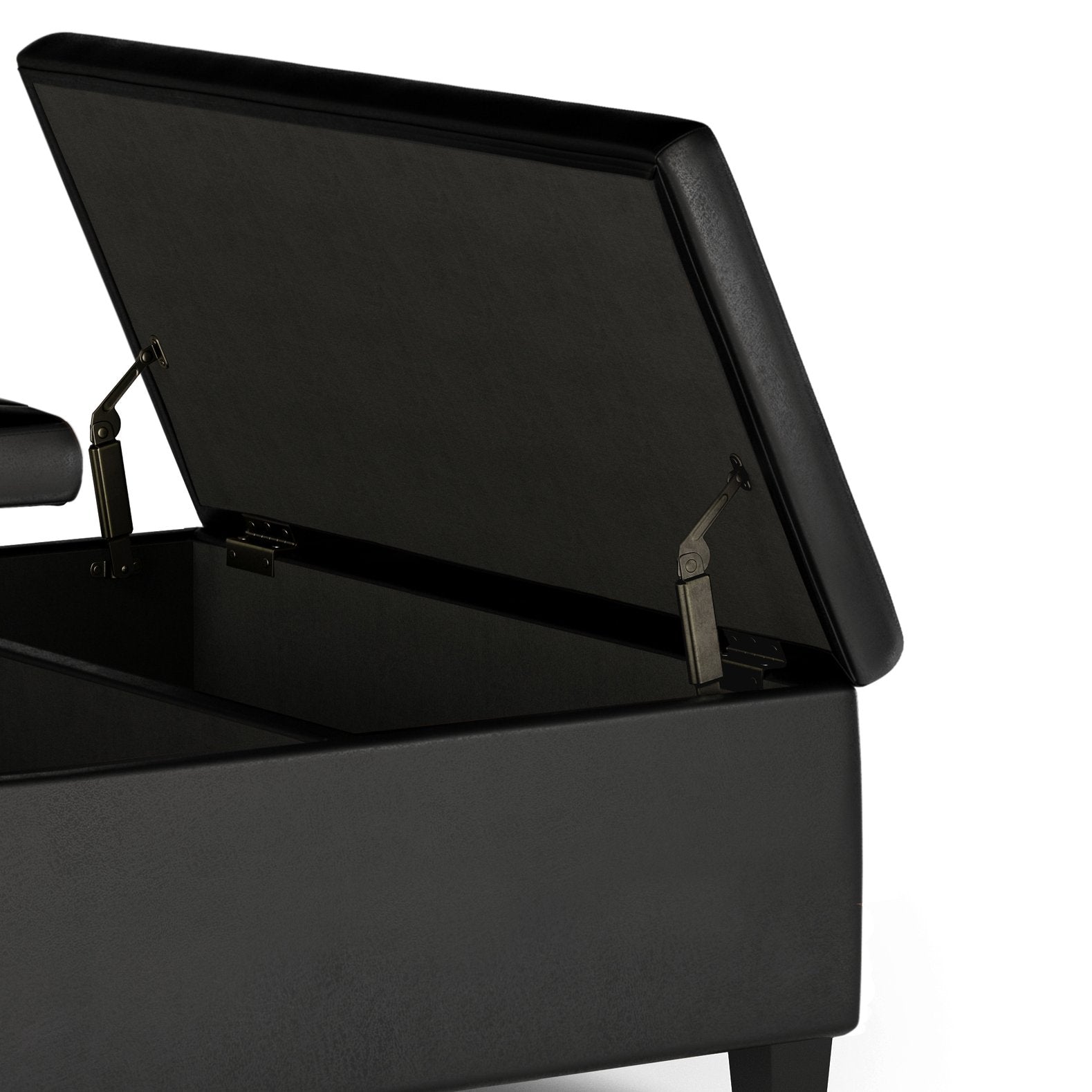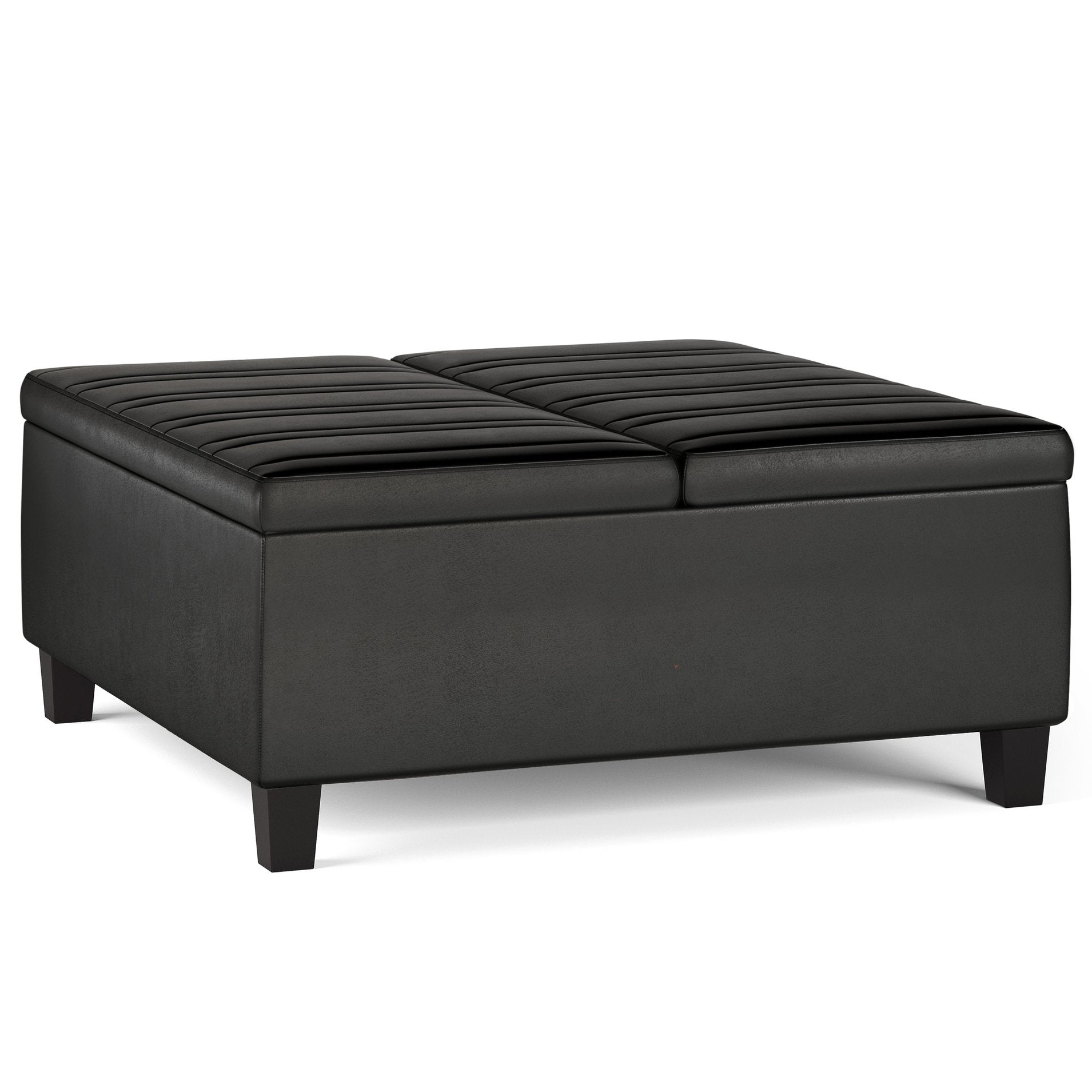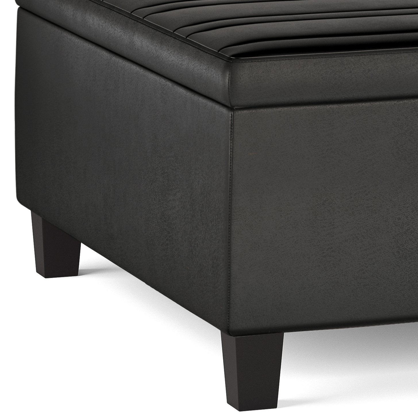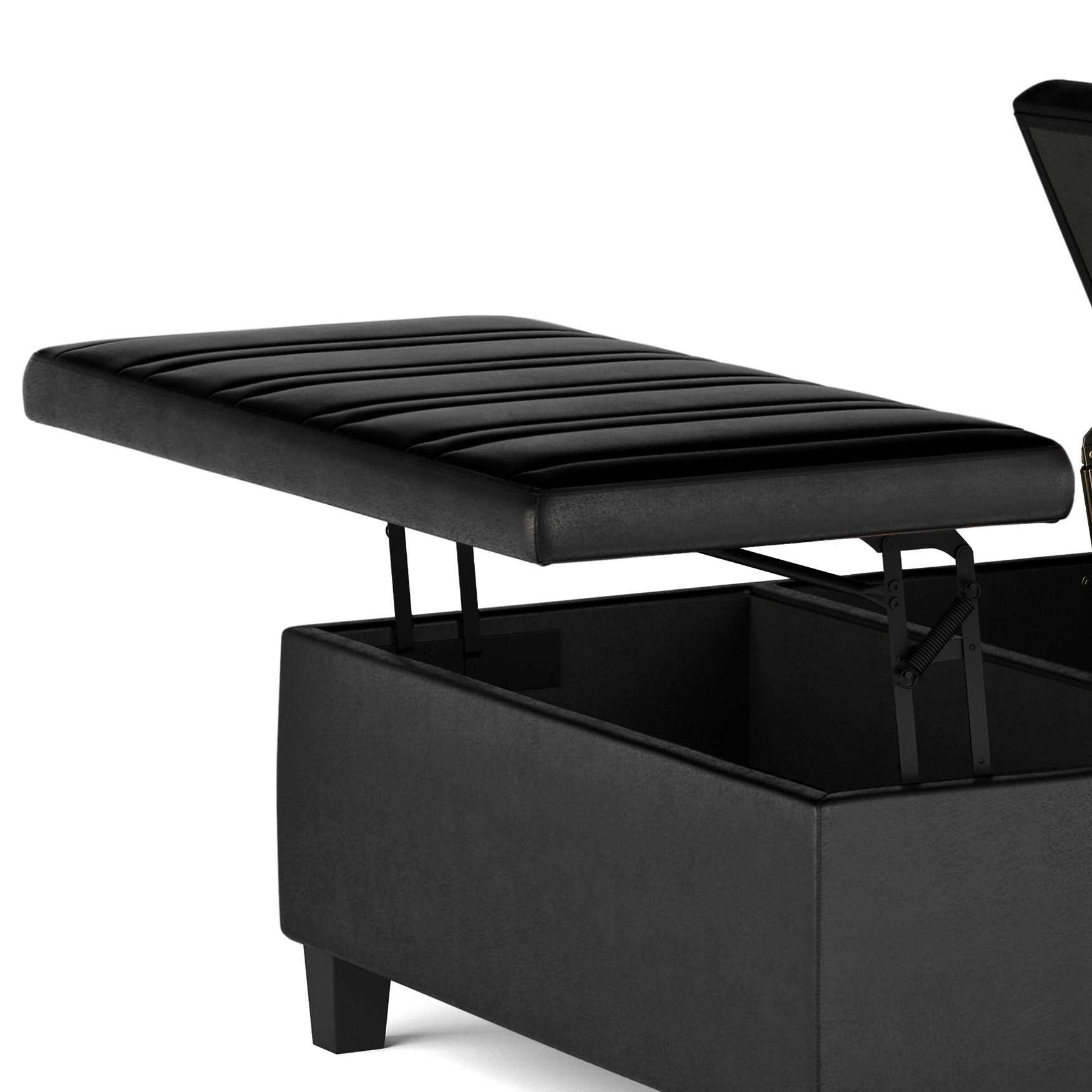 Crafted for versatile living spaces, this Ellis storage ottoman blends contemporary style with practical functionality. Upholstered in distressed black vegan faux leather with vertical stitching, it serves as a coffee table, extra seating, footrest, or hidden-storage solution—ideal for living rooms, family rooms, or dens. The split lift-top with child-safety hinge makes it convenient for laptop use or casual dining, while the generous interior keeps blankets, magazines, and games neatly out of sight.