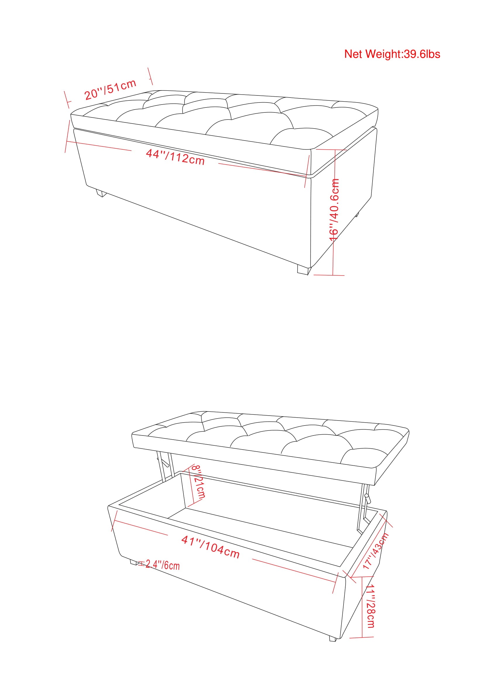 - Dimensions: 44" W x 20" D x 16" H (also listed as 39.76" L x 20.47" W x 14.96" H — please verify which measurement aligns with your space)