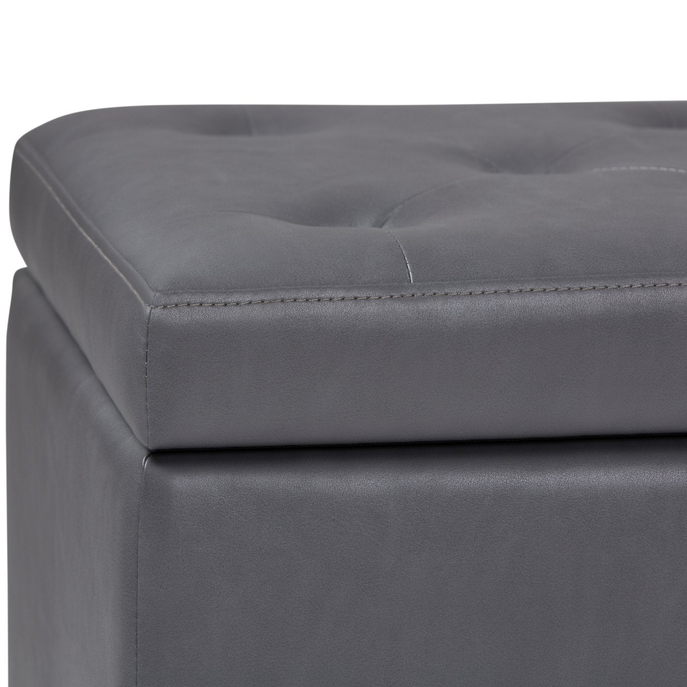 Add practical storage and refined style to any room with this versatile storage ottoman. Upholstered in durable stone-grey vegan faux leather, it blends transitional charm—tufted diamond detailing and nailhead trim—with everyday functionality, offering comfortable seating, a footrest, or an entryway bench that conceals clutter inside.