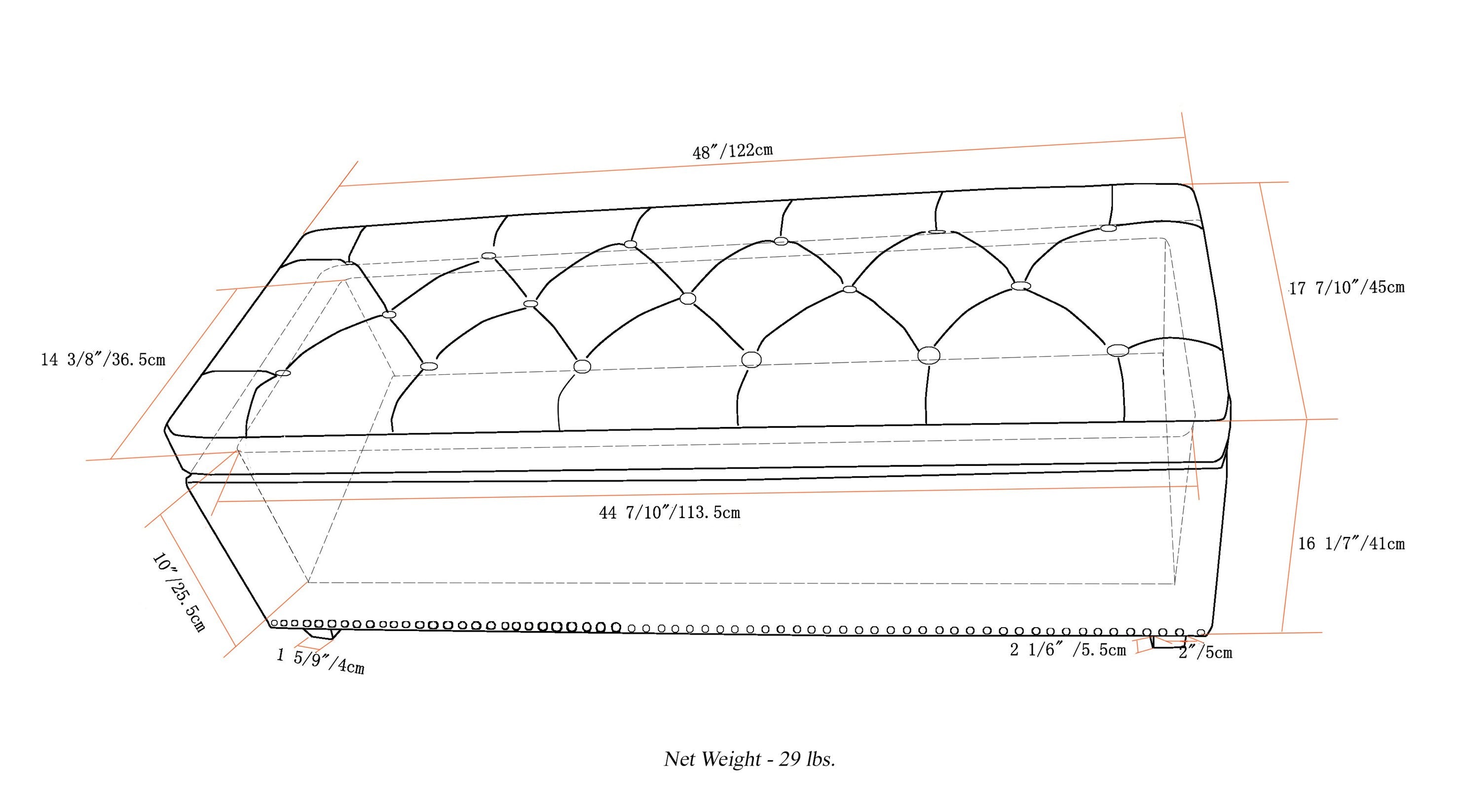 - Dimensions: 48.43" L x 18.11" W x 14.96" H (listed also as 48" W x 17.7" D x 16" H)
