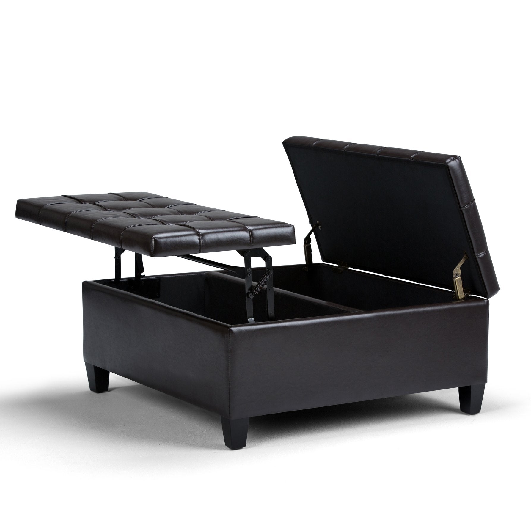 Enjoy versatile style and smart storage with this transitional square storage ottoman upholstered in Tanners Brown vegan faux leather. Designed for everyday use, it combines a comfortable cushioned top with a split lift-up lid for easy access to a generous interior compartment — perfect for stashing blankets, games, or work-from-home essentials. The stitched tufting detail and clean lines make it equally suitable as a coffee table, extra seating, footstool, or accent piece.