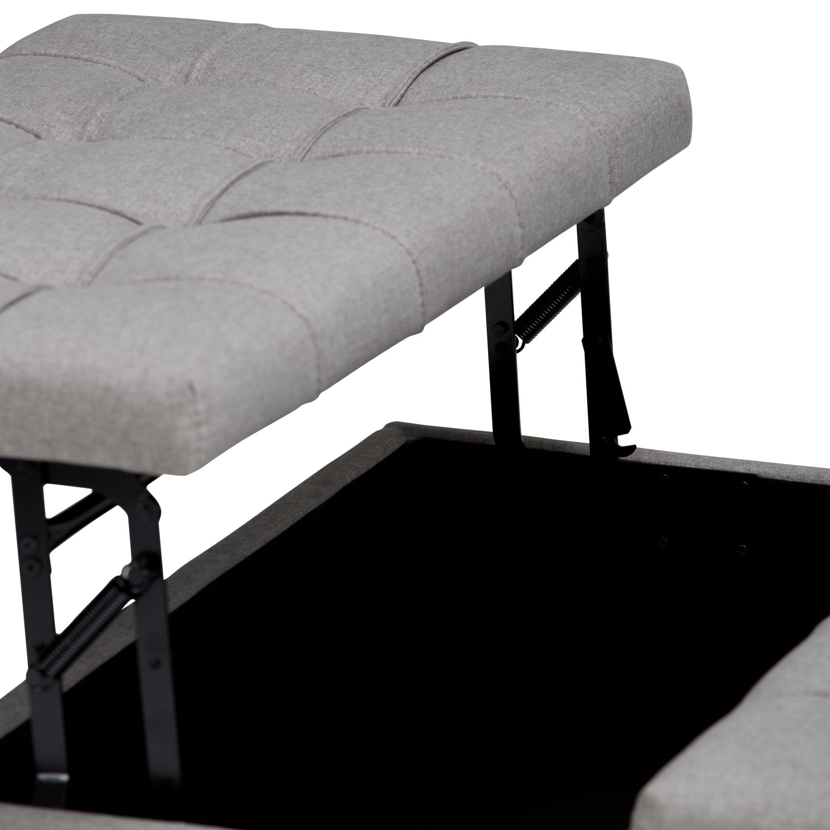 Bring smart storage and versatile style to your living space with this transitional Dove Grey storage ottoman. Upholstered in a durable linen-look fabric with stitched tufting, it combines comfortable seating, a workable surface, and generous hidden storage—perfect as a coffee table, extra seating, footrest, or a kid-friendly dining spot. The split lift-top with child-safety hinge makes accessing the large storage compartment easy and safe, while solid and engineered wood construction with high-density foam ensures lasting comfort and support.