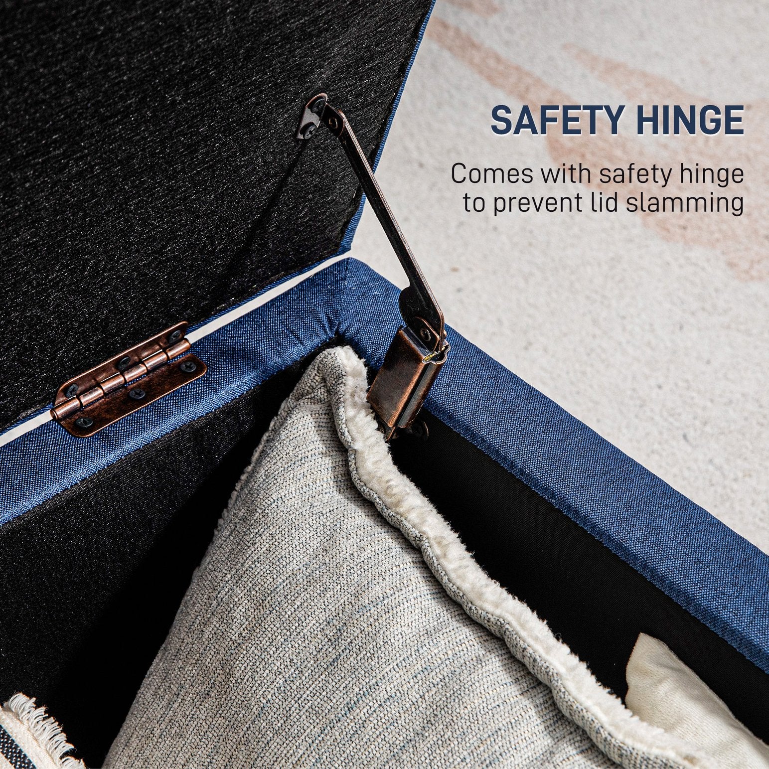 Add a touch of classic elegance and practical storage to your living room, entryway, or bedroom with this button‑tufted storage ottoman. Padded with breathable linen‑touch polyester and supported by a sturdy eucalyptus wood frame, it provides comfortable extra seating while hiding away blankets, toys, or magazines. A metal hinge locks the flip‑top lid open for safe access and prevents accidental slams, making it a family‑friendly addition to your home.