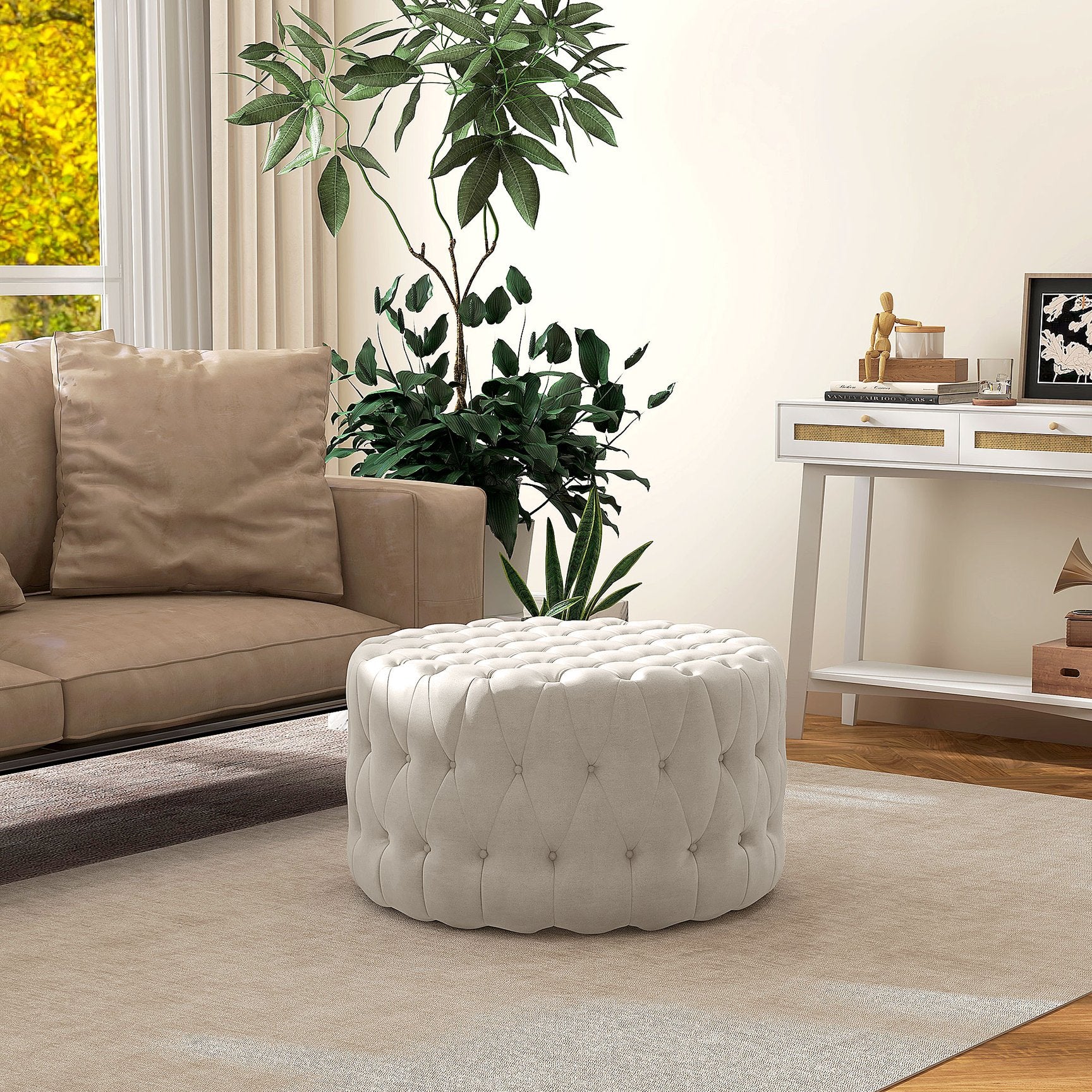 Add a touch of modern elegance and practical comfort to your living space with this large, round velvet-feel ottoman. Its button-tufted top and plush padding provide a stylish focal point that doubles as extra seating, a footrest, or a casual surface for a tray. The neutral beige upholstery blends easily with many decor styles, while the sturdy construction supports everyday use.