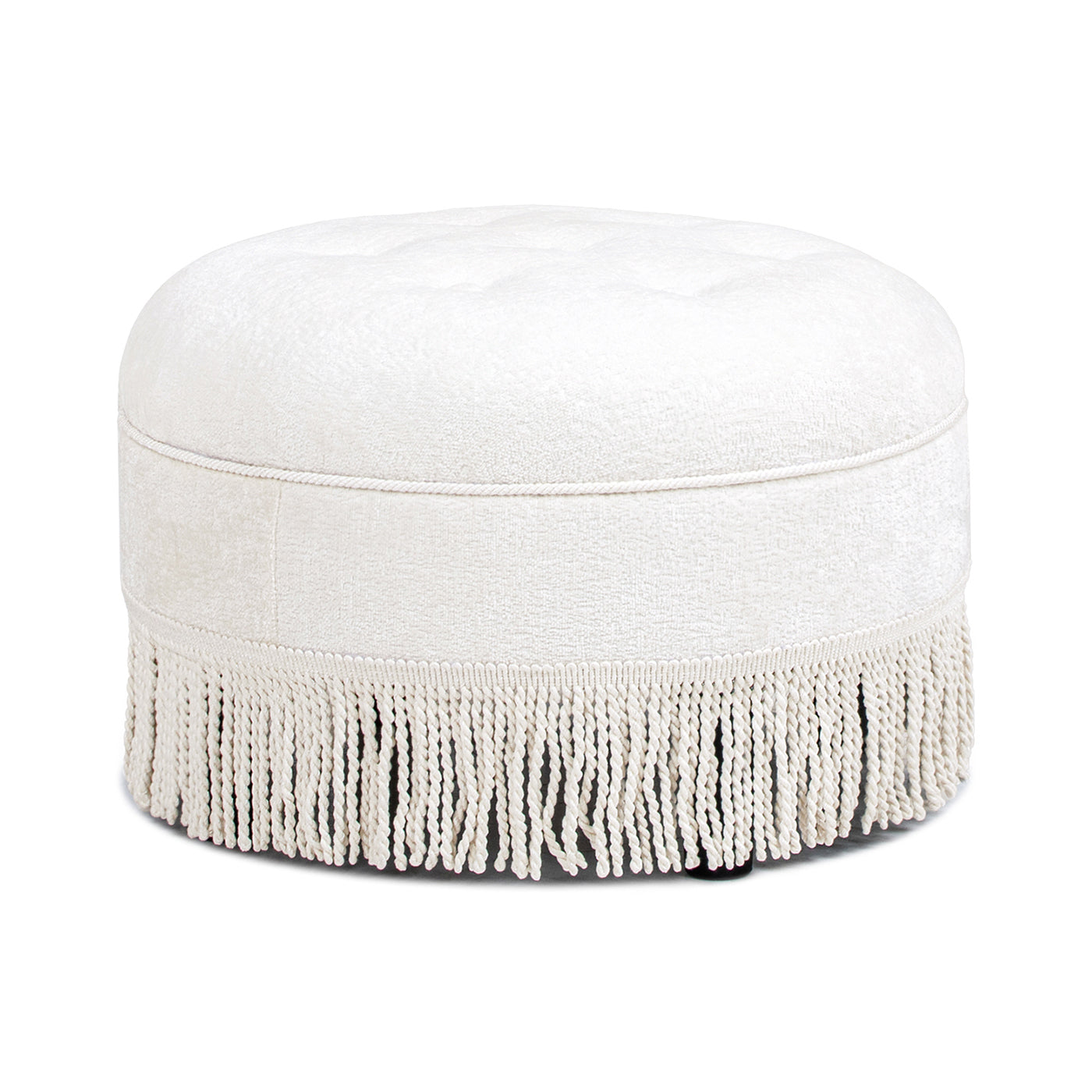 Add a touch of classic charm and versatile functionality to any room with this round upholstered accent ottoman. Handcrafted by skilled artisans and upholstered in soft almond-white chenille, it pairs vintage-inspired details with durable construction to serve as a stylish footrest, extra seat, or low side table.