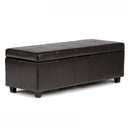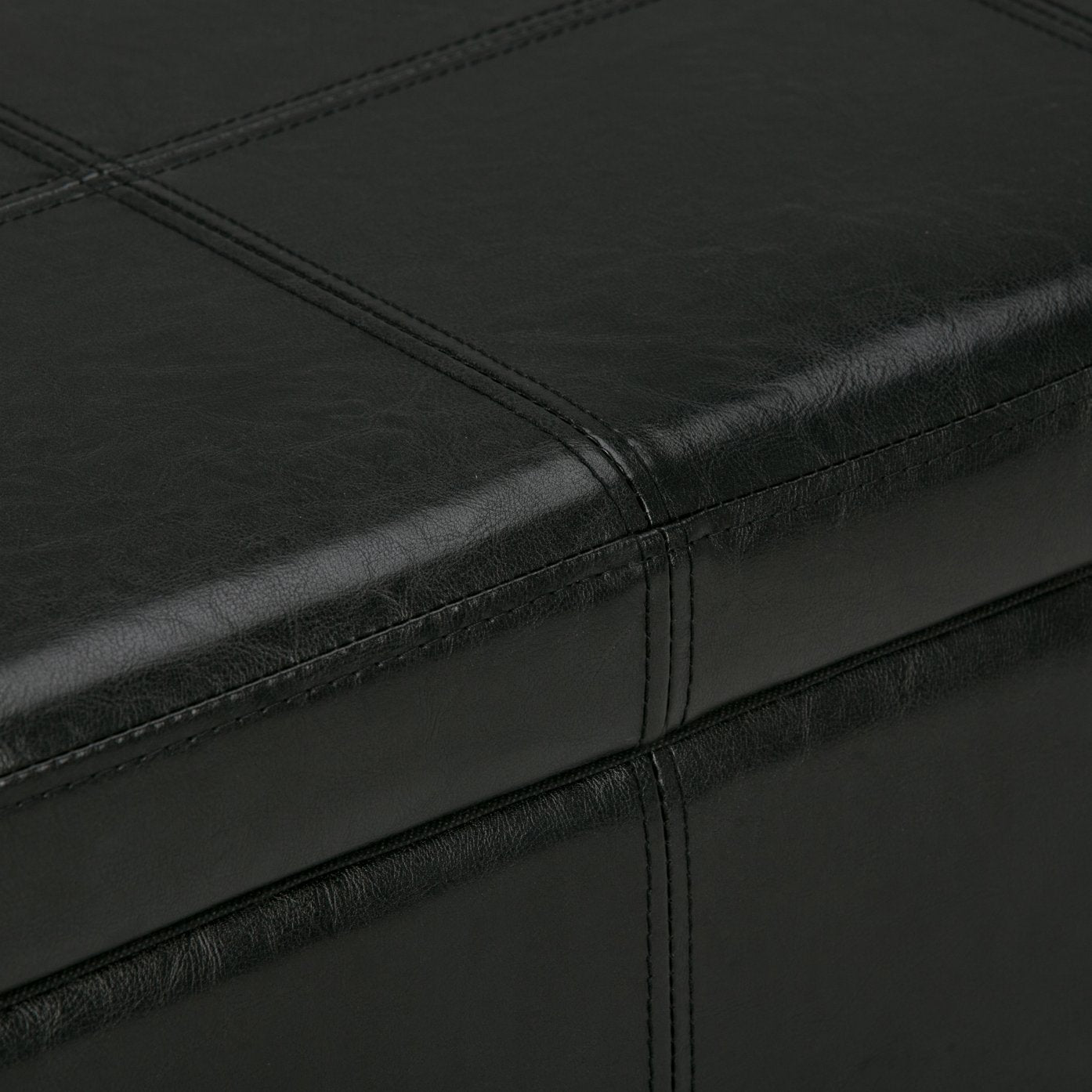 An elegant and versatile addition to any room, the Kingsley Large Storage Ottoman combines stylish transitional design with practical storage and seating. Upholstered in durable coffee brown vegan faux leather with top stitching and nailhead trim, it offers a refined look while providing a roomy, safe storage solution and comfortable extra seating for living rooms, bedrooms, hallways, or entryways.