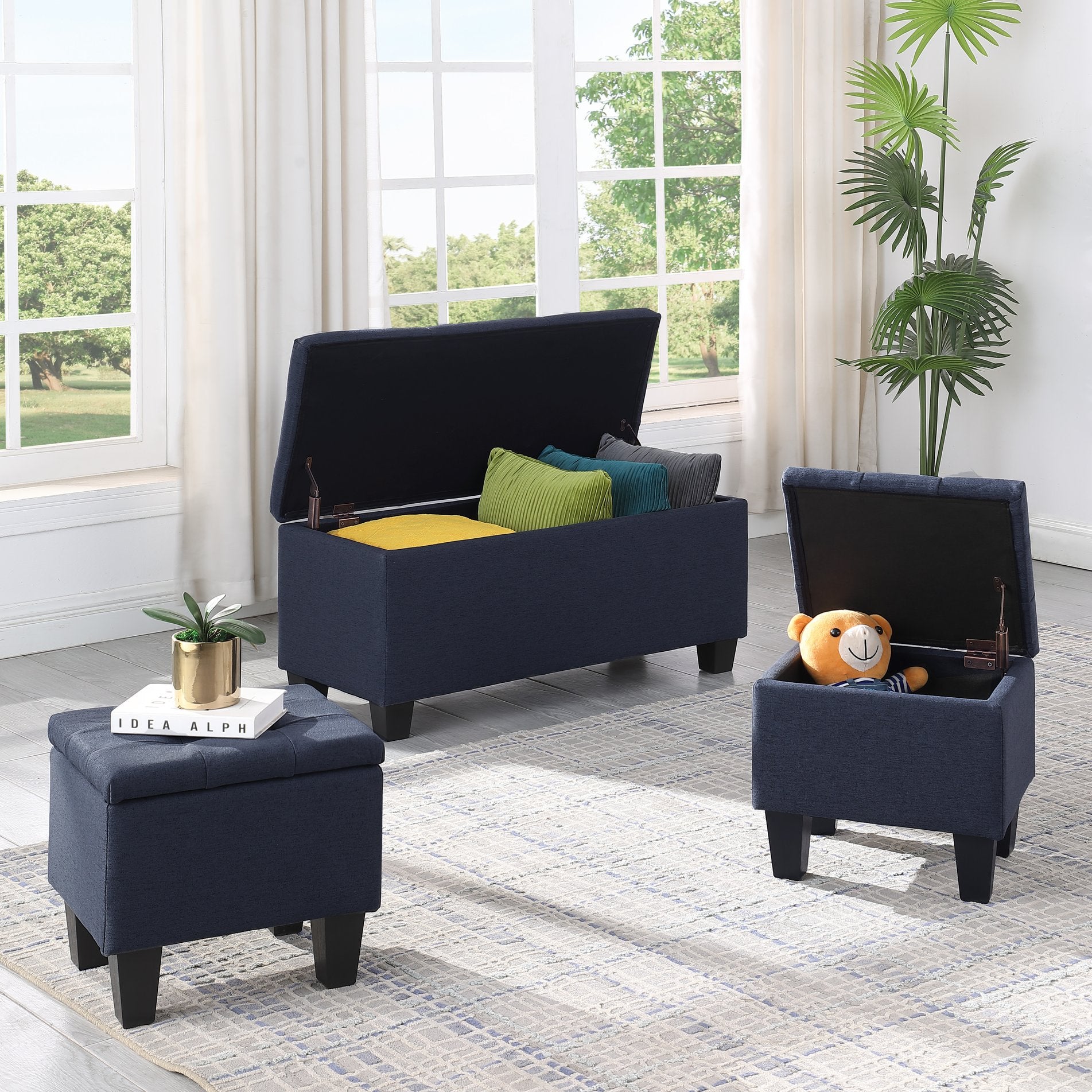 Bring order and style to any room with this versatile 3-in-1 storage ottoman set. Designed for everyday use, the set includes one large storage bench and two matching small ottomans that combine comfortable seating, hidden storage, and a classic tufted linen look—perfect for living rooms, entryways, bedrooms, or hallways.