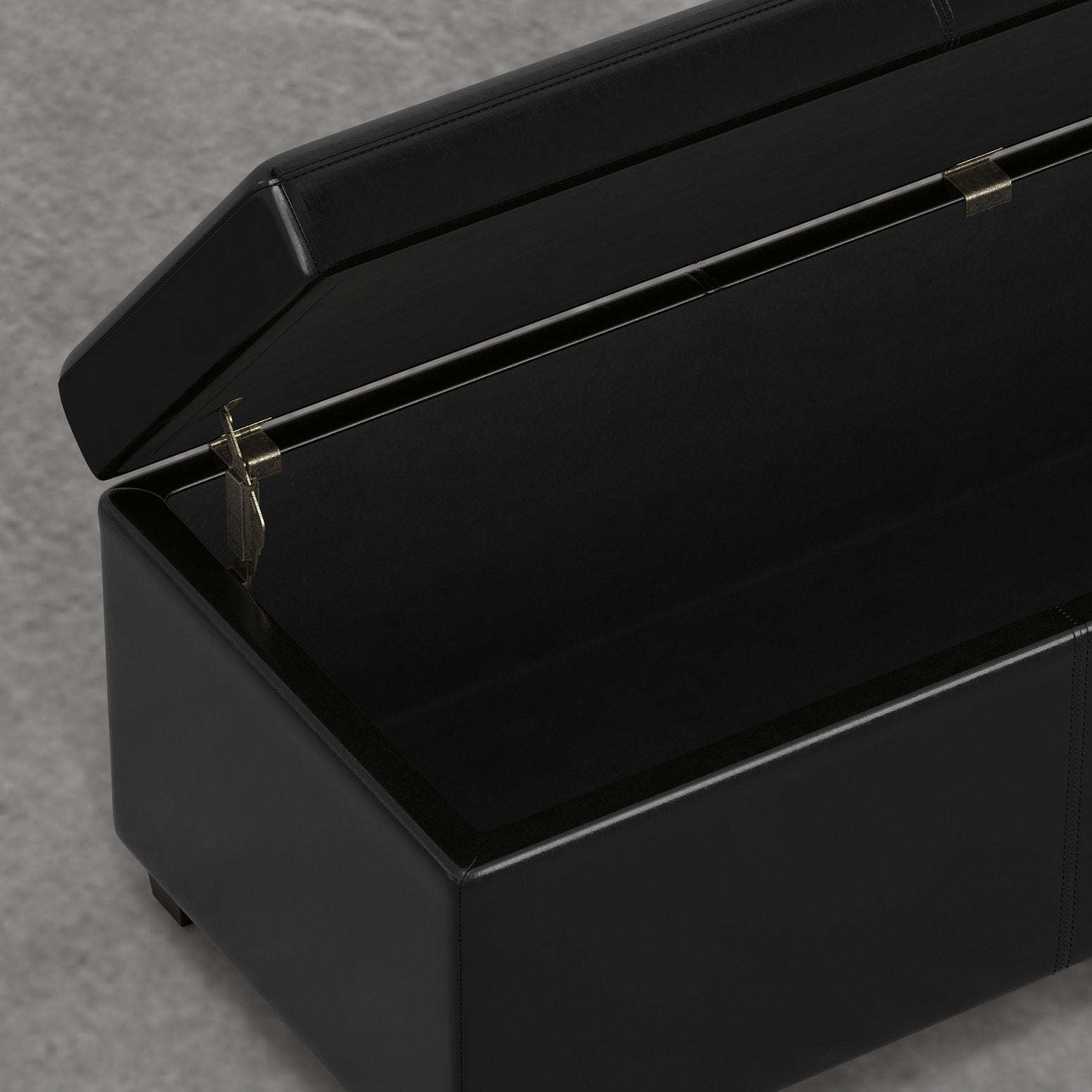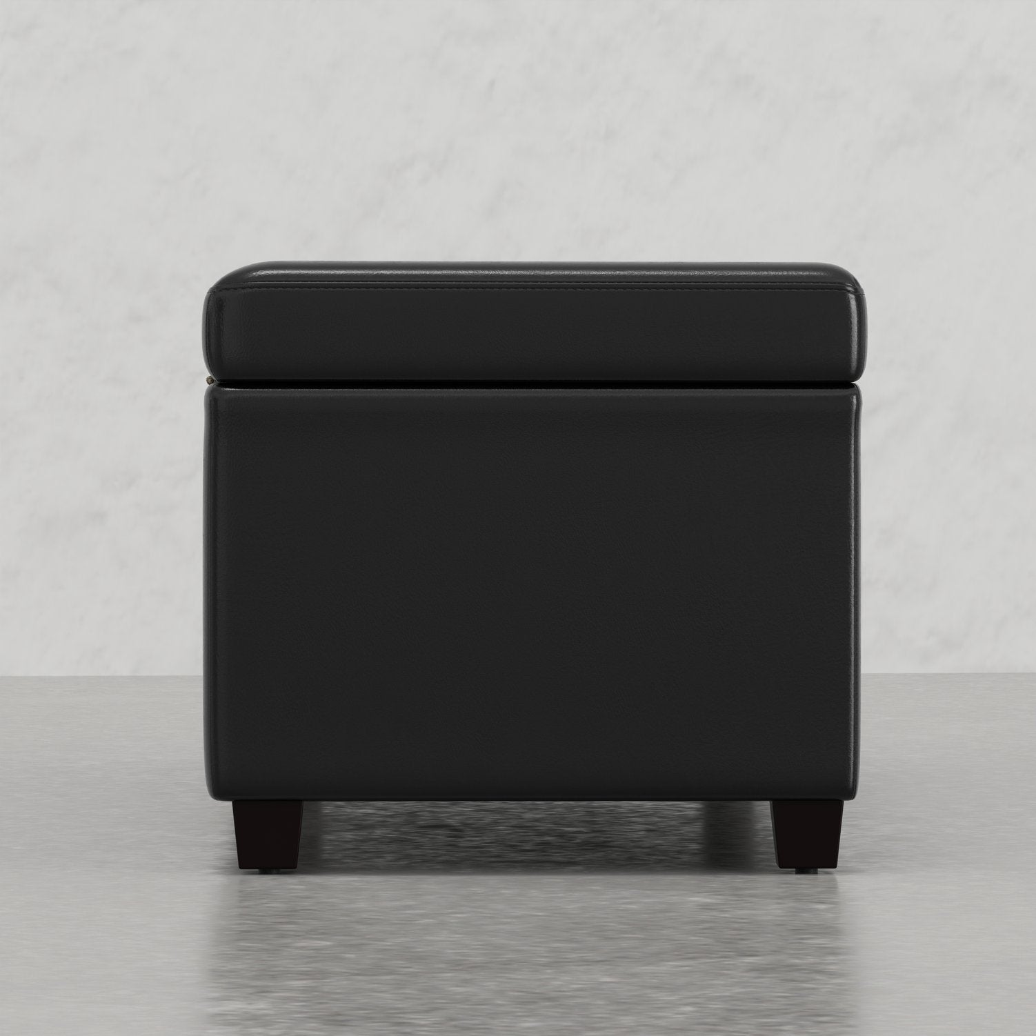 Bring style and smart storage together with the Lincoln Extra Large Storage Ottoman Bench. Upholstered in midnight black vegan faux leather with decorative stitching, this versatile piece offers comfortable seating, hidden storage, and a contemporary silhouette that fits entryways, living rooms, bedrooms, or hallways. Built with solid and engineered wood, it’s designed for everyday use and easy assembly—just attach the legs.