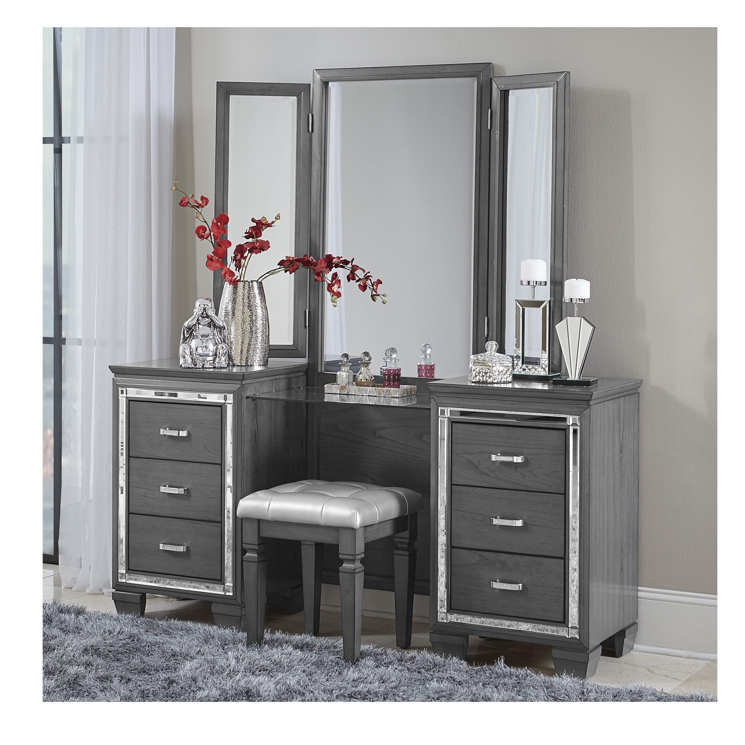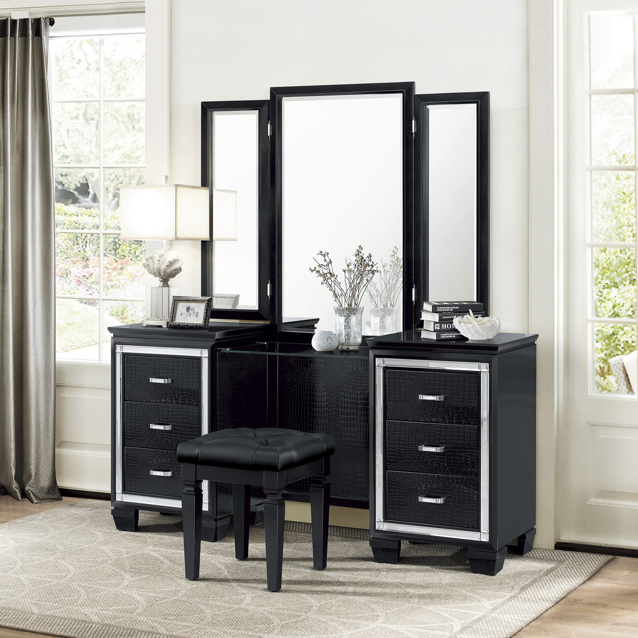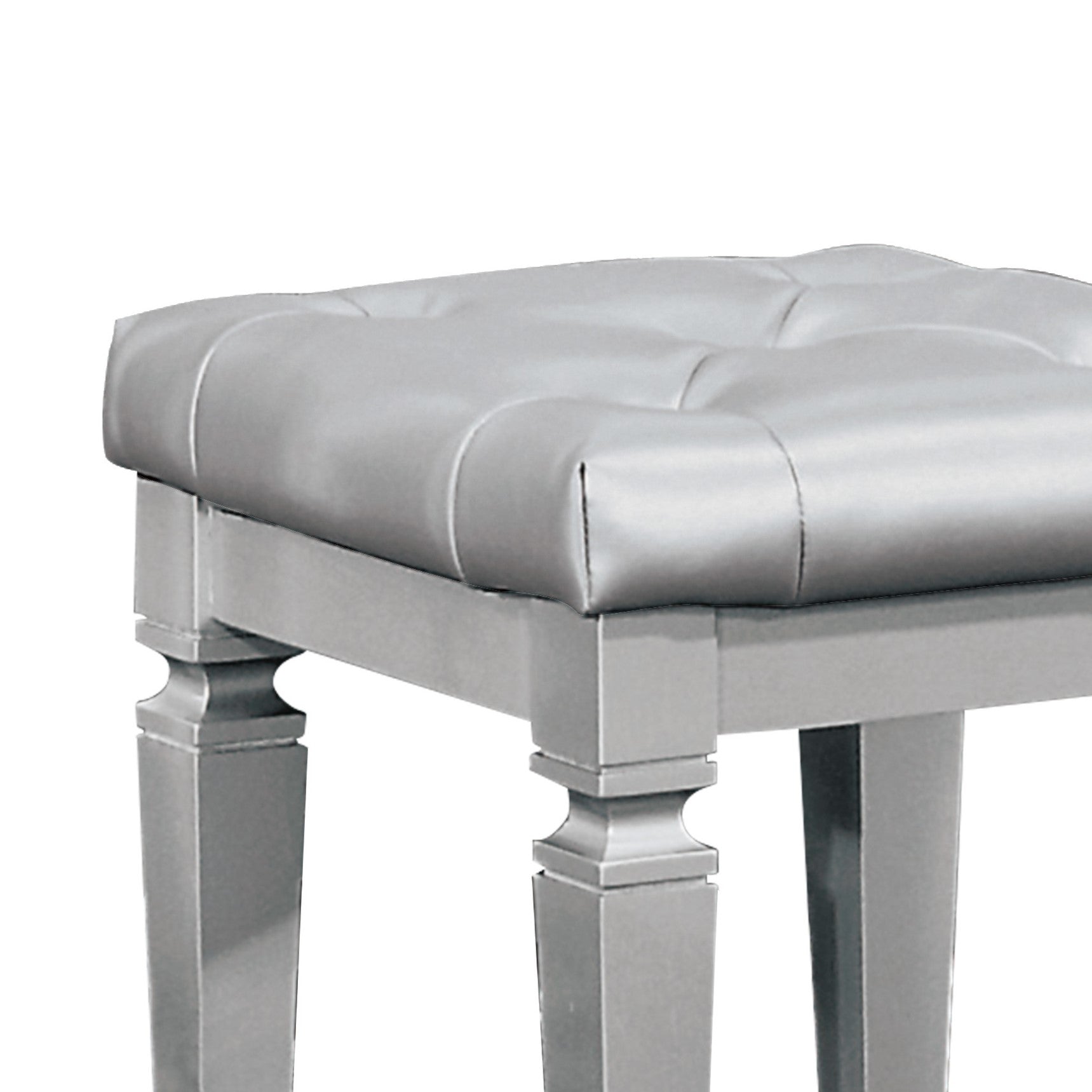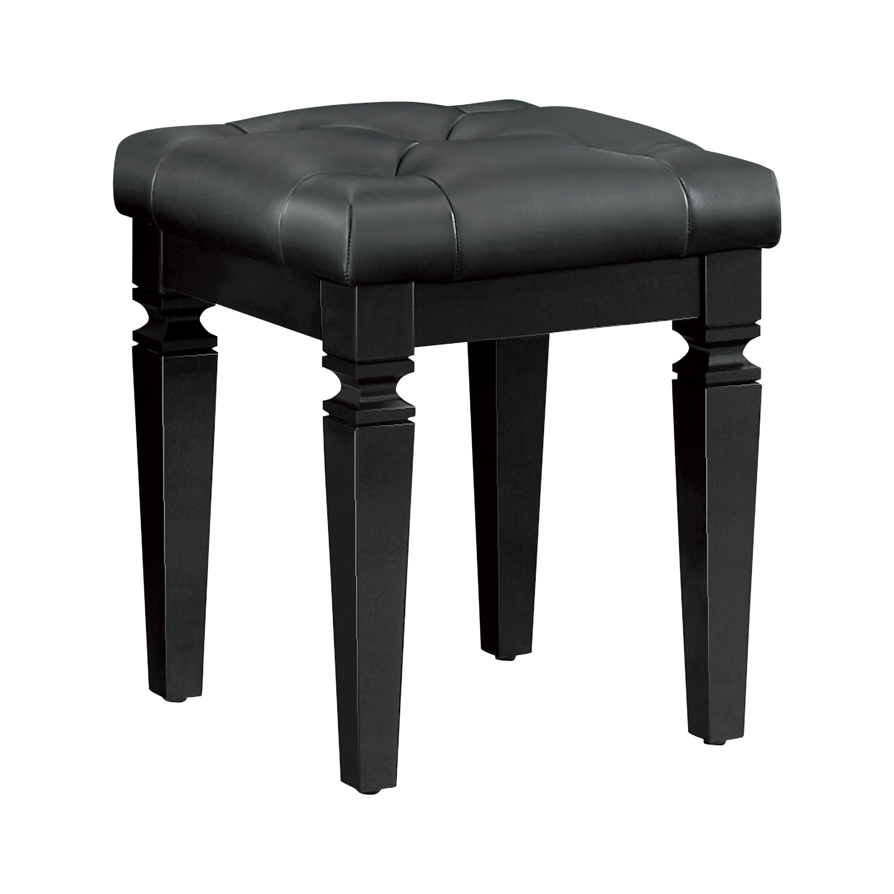 Bring a touch of modern glamour to your bedroom or dressing area with this luxurious vanity stool. Upholstered in black faux leather with a tufted seat and sparkling acrylic crystal accents, it adds refined style and spotlight-ready sparkle to any vanity setup. The sturdy black-finished frame complements contemporary and transitional decor while offering comfortable seating for daily use.
