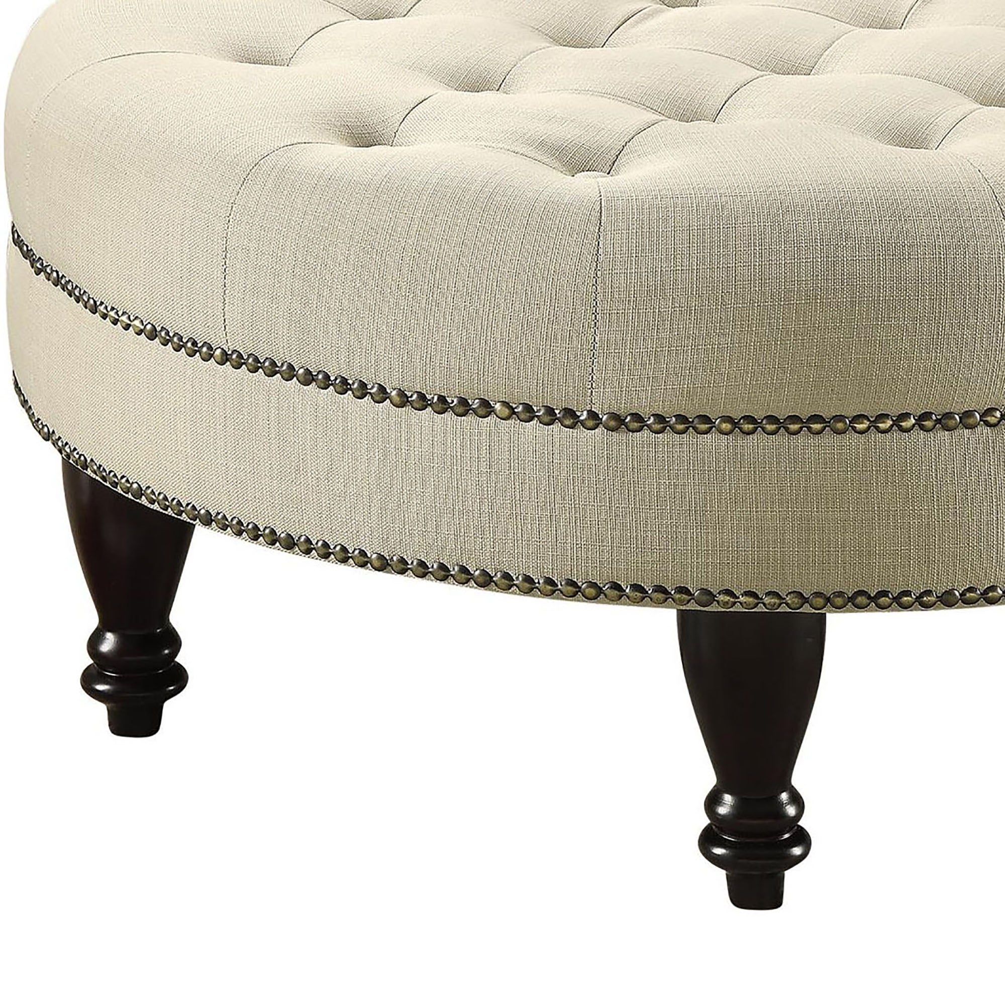 A refined centerpiece for traditional living spaces, this round cocktail ottoman blends classic tailoring with versatile function. Its creamy oatmeal upholstery, button tufting, and nailhead trim create an upscale, tactile look while the turned wood legs in a rich dark brown finish ground the piece with timeless elegance. Use it as extra seating, a low coffee table with a tray, or a chic footrest to elevate your room’s decor.