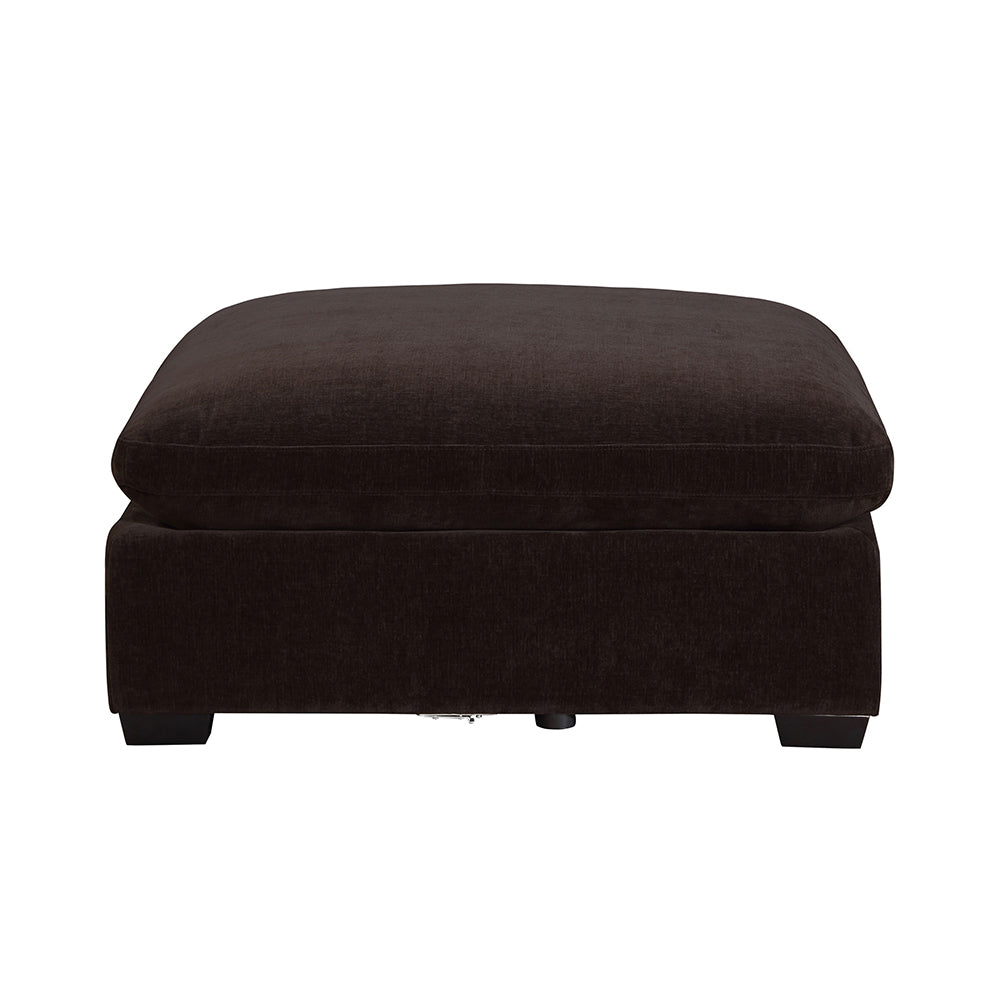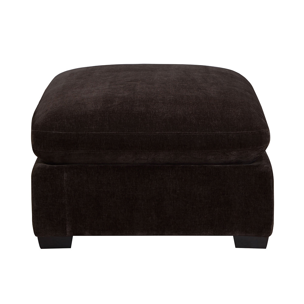 - Warm upholstery graces a modern square ottoman for a soft, inviting look