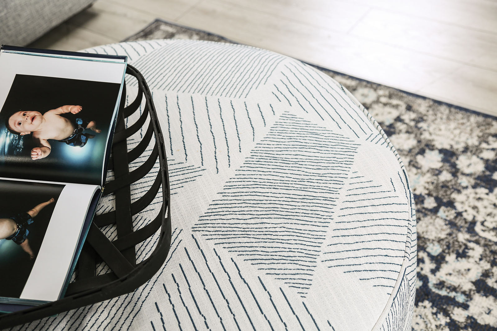 Add a touch of transitional elegance and practical comfort to your living space with this round upholstery ottoman. Its clean geometric pattern, welt trim, and two-tone gray and navy finish create a versatile focal point that works equally well in modern, coastal, or classic interiors. Use it as extra seating, a footrest, or a low-profile coffee table with a tray.
