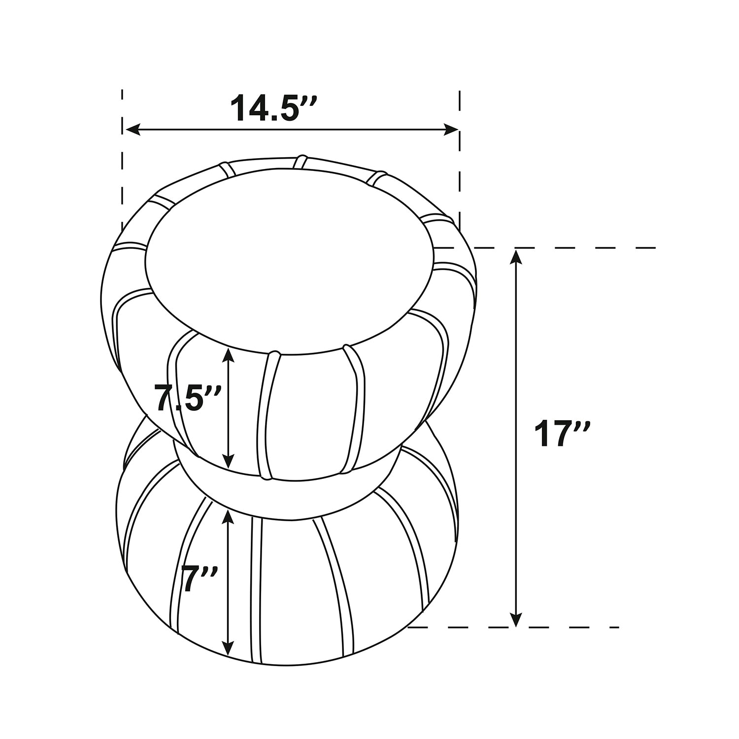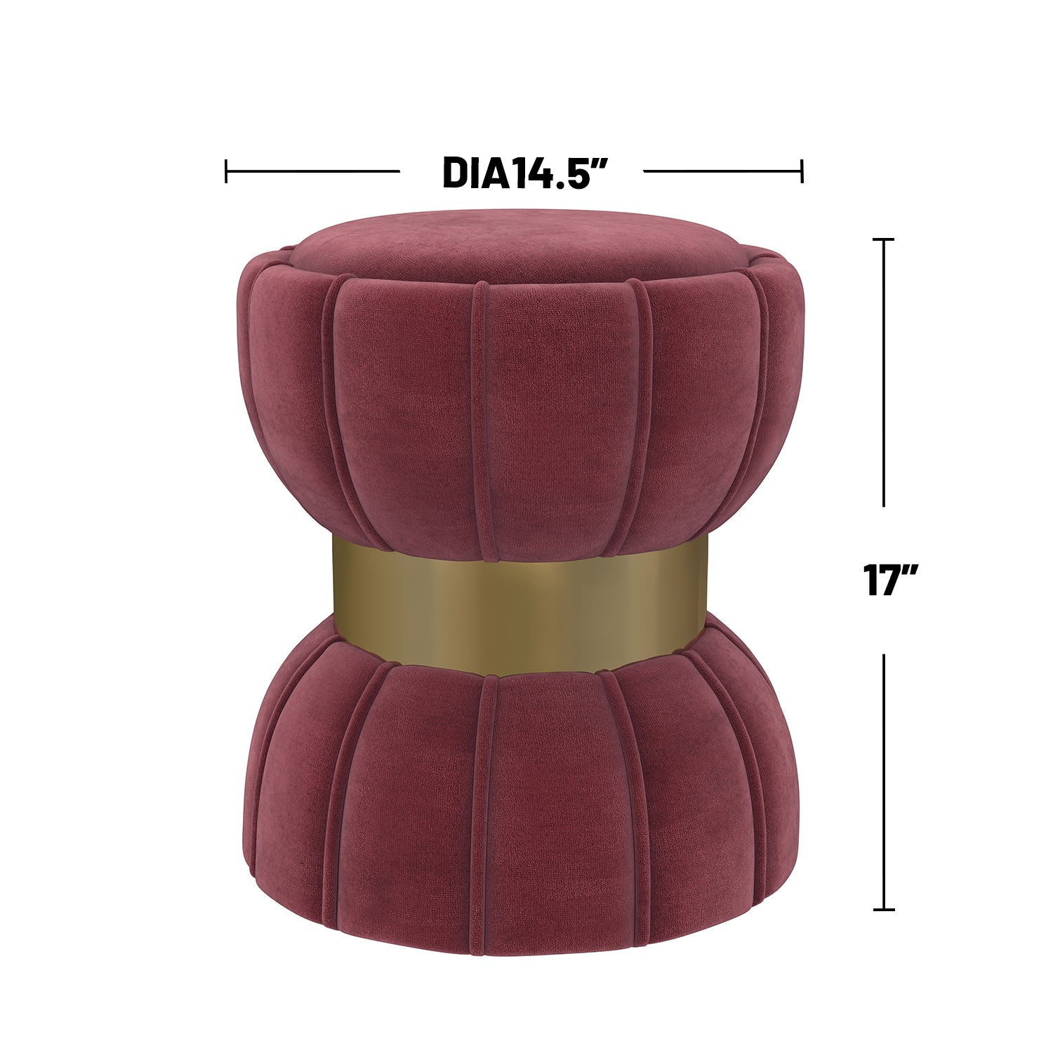 Add a touch of modern glam to any room with this round velvet ottoman. Its sculpted hourglass silhouette and bright gold band create a refined focal point, while plush velvet upholstery and vertical piping deliver tactile comfort and visual depth. Compact yet versatile, this ottoman functions as a footrest, extra seating, or a casual surface for a book or phone—perfect for living rooms, bedrooms, or entryways.