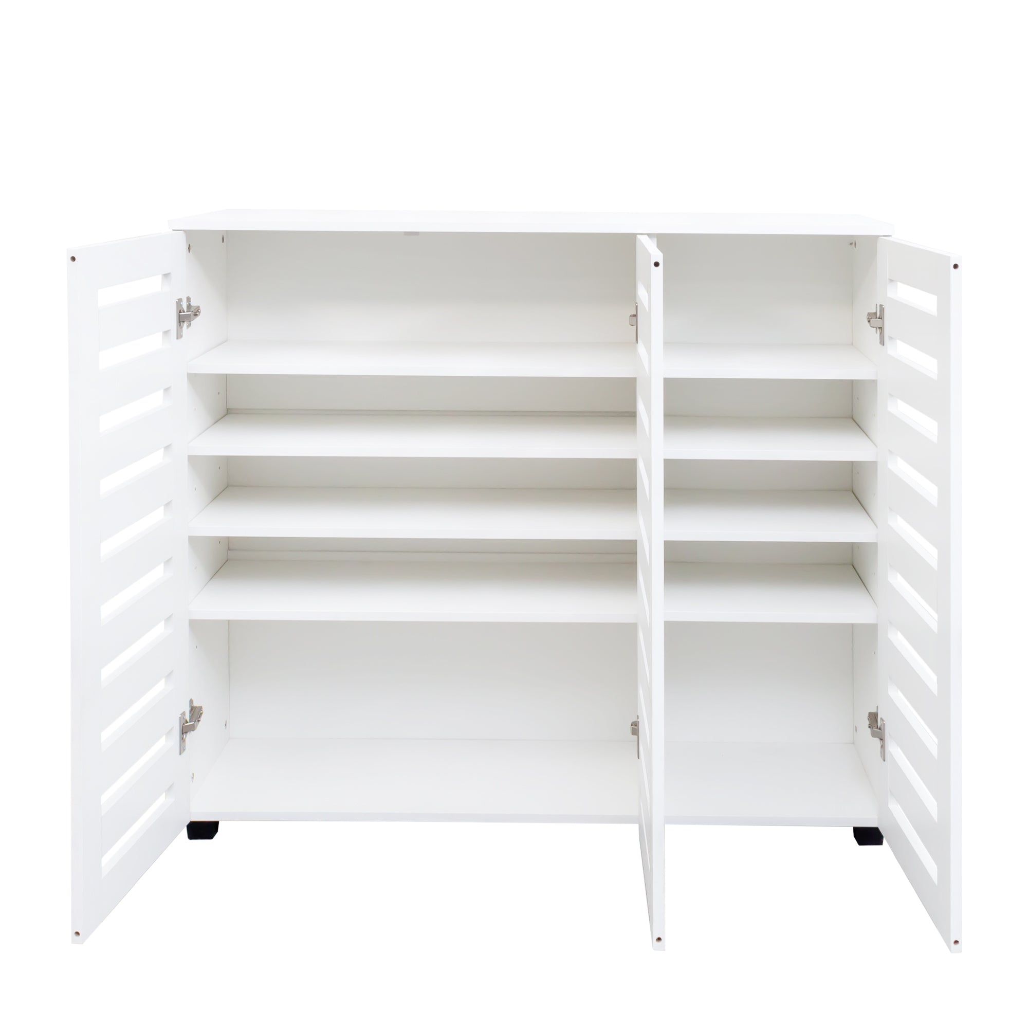 - Ventilated louvered doors: Slatted door design promotes airflow to keep shoes fresh while offering a neat, concealed appearance