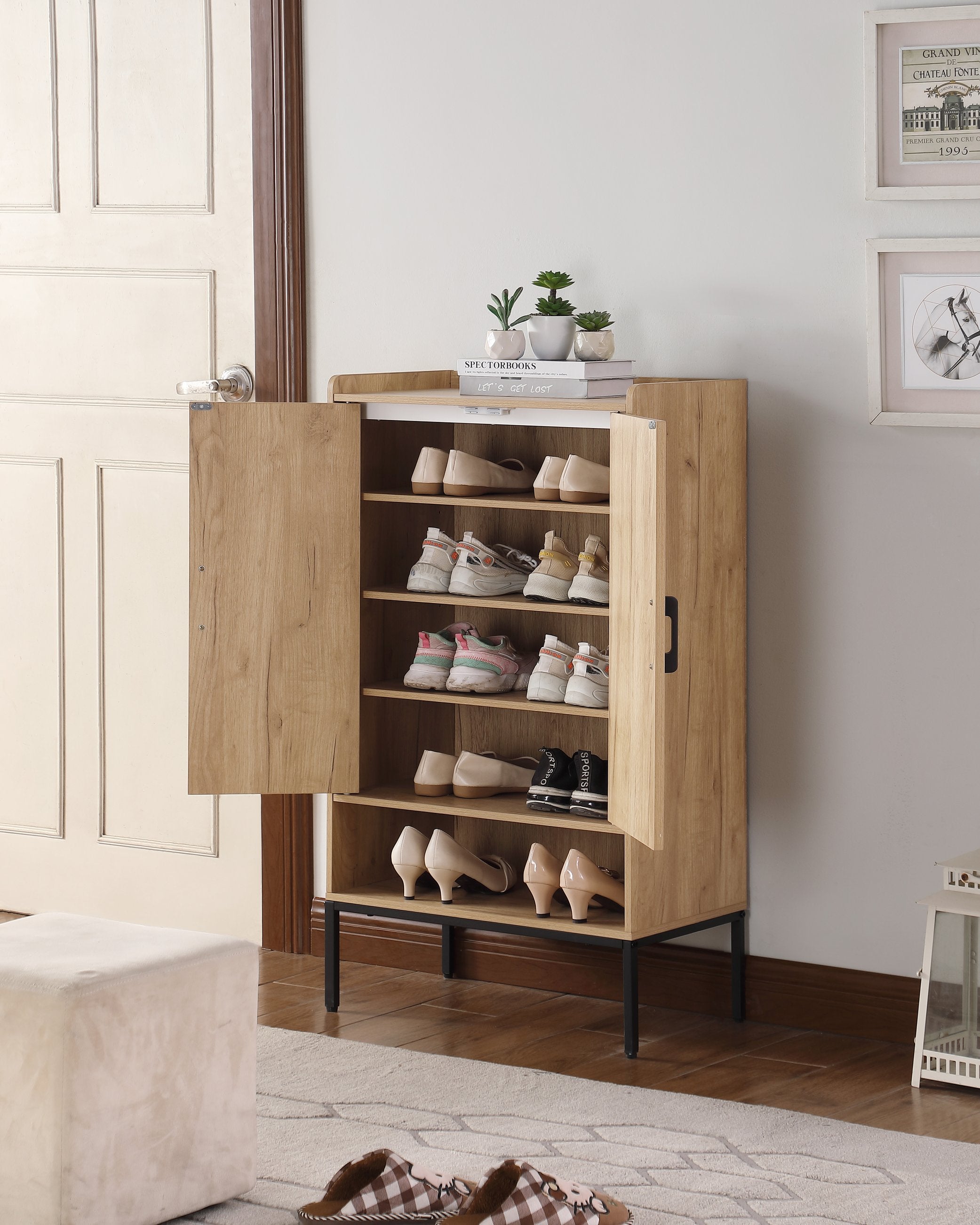 - Storage configuration: Five tiers including enclosed compartments behind two rattan doors plus open shelves for frequently worn shoes, slippers or decorative items