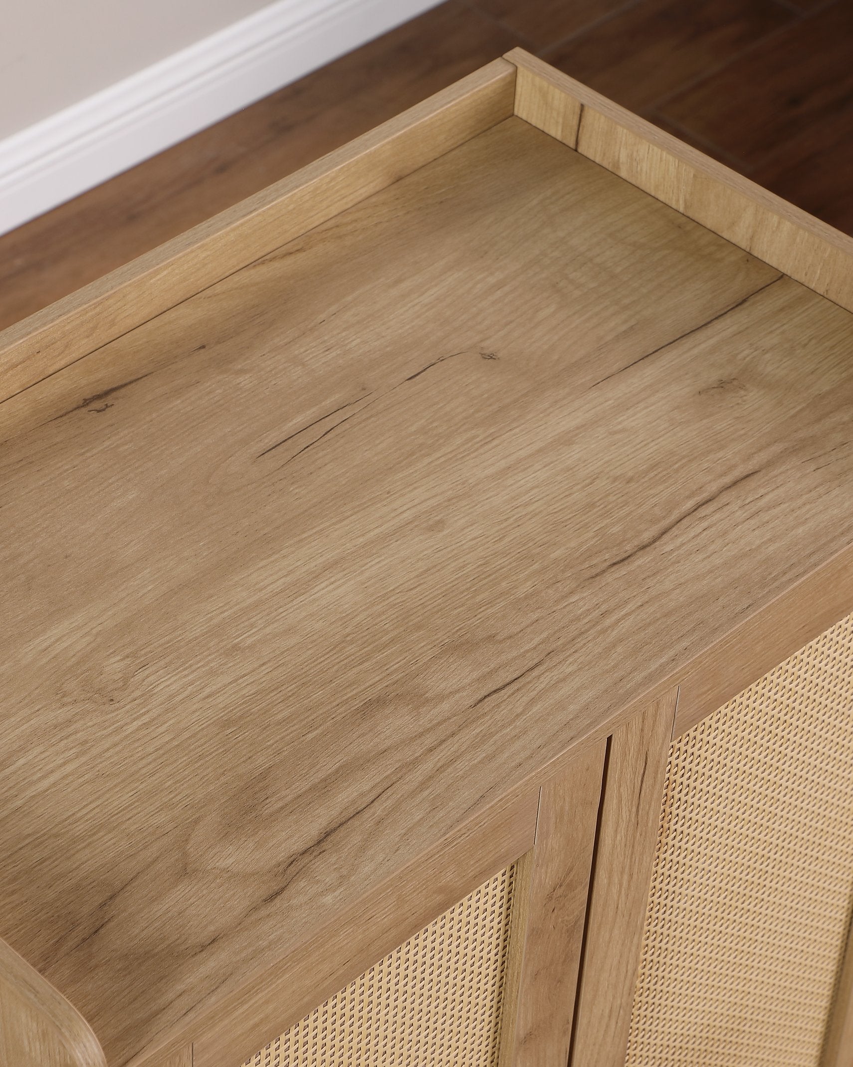 - Charming your entryway or bedroom with the timeless appeal of this shoe cabinet featuring natural rattan doors. The handwoven rattan panels not only add a touch of bohemian and rustic charm but also provide ventilation to keep your shoes fresh. The warm, natural wood finish beautifully complements the rattan, creating a harmonious look that effortlessly enhances any home decor style.