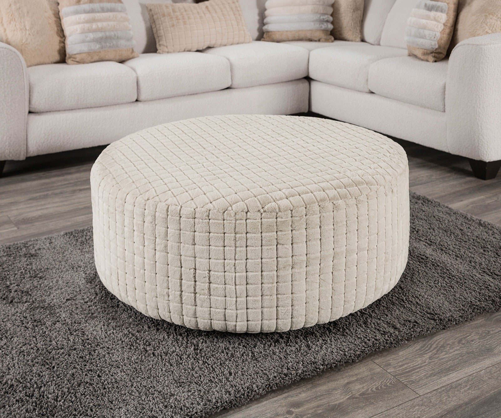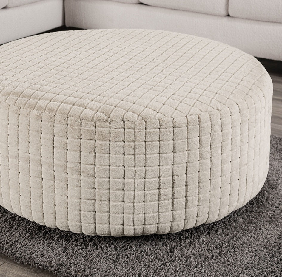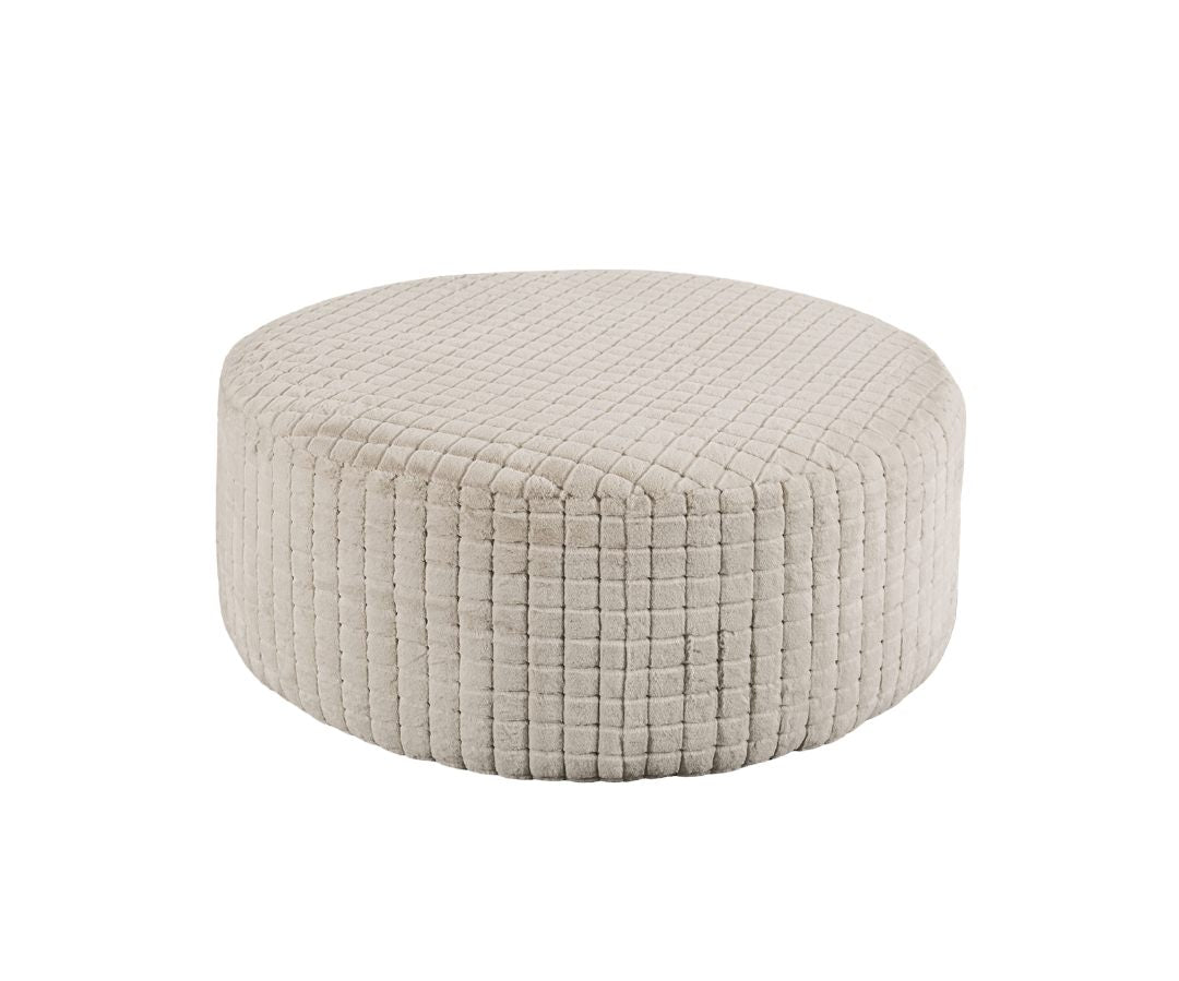 Elevate your living space with this generously sized round ottoman from the Iroquois collection—designed to blend transitional elegance with everyday comfort. Upholstered in a patterned tan/beige chenille, its soft, cushioned surface makes it ideal as a footrest, extra seating, or a casual coffee-table substitute. Clean lines and a legless profile create a seamless, contemporary look that pairs easily with a variety of décor styles.