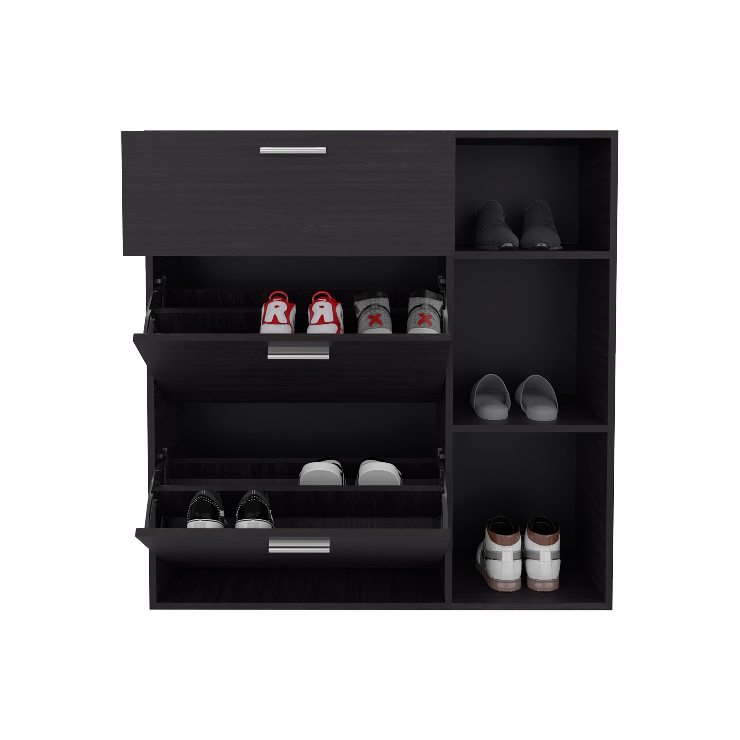 - Wenge shoe storage cabinet features three shelves and two tilt-out drawers, providing ample organized space for shoes and accessories