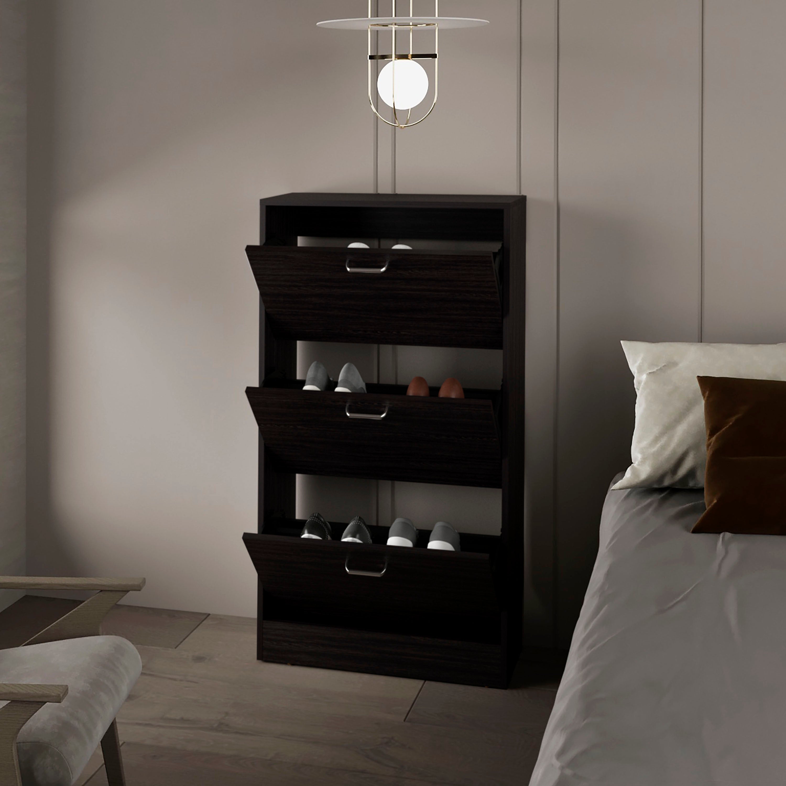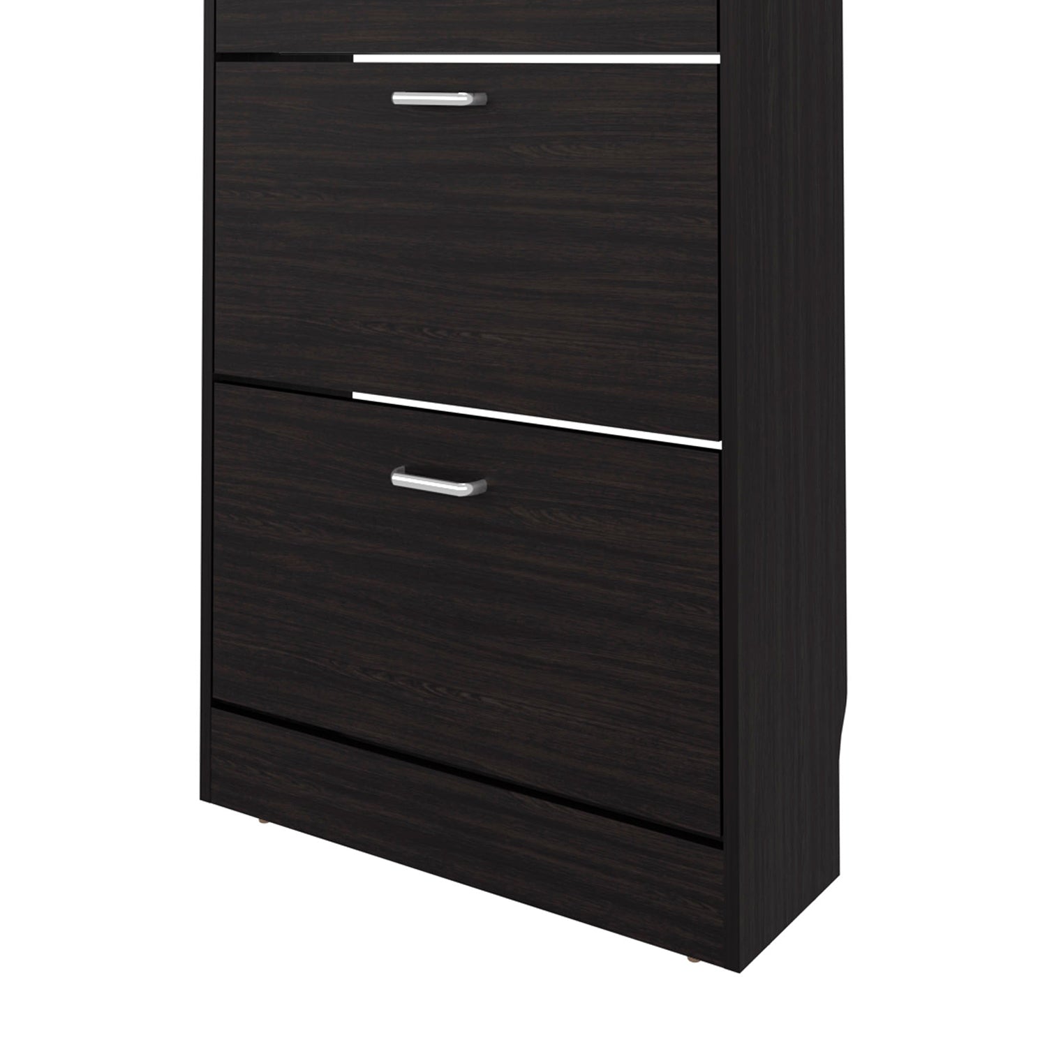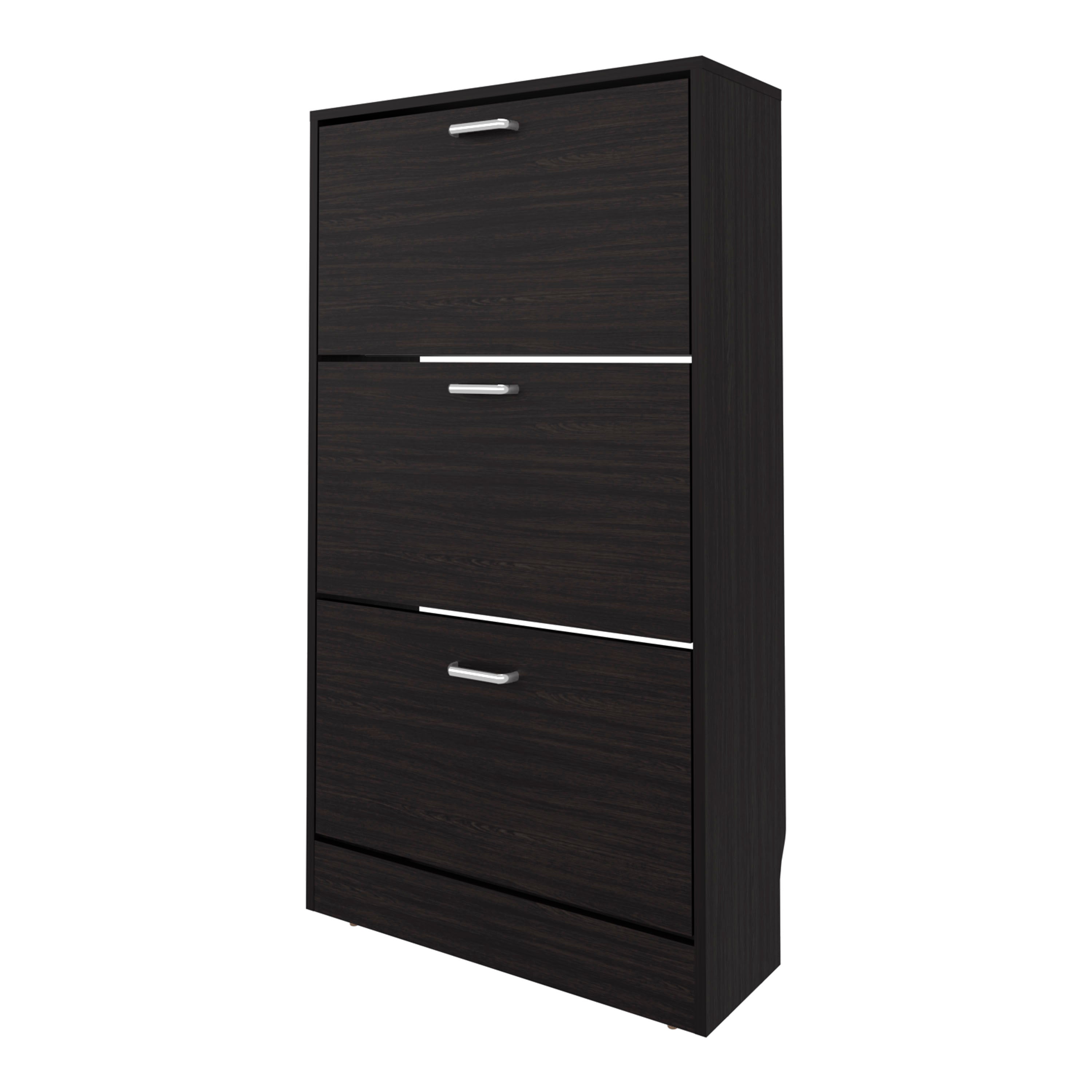 Give your entryway or closet a polished, space-saving solution with this Wenge shoe rack. Its slim vertical profile and rich dark finish deliver a modern, unobtrusive look while the three flip-down compartments keep footwear neatly concealed and organized — perfect for narrow hallways, apartments, or mudrooms that need tidy storage without sacrificing style.