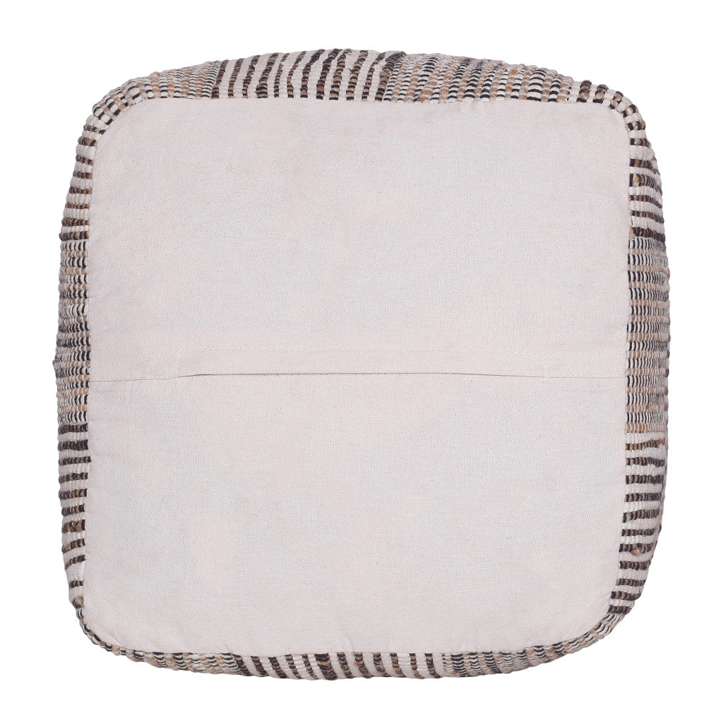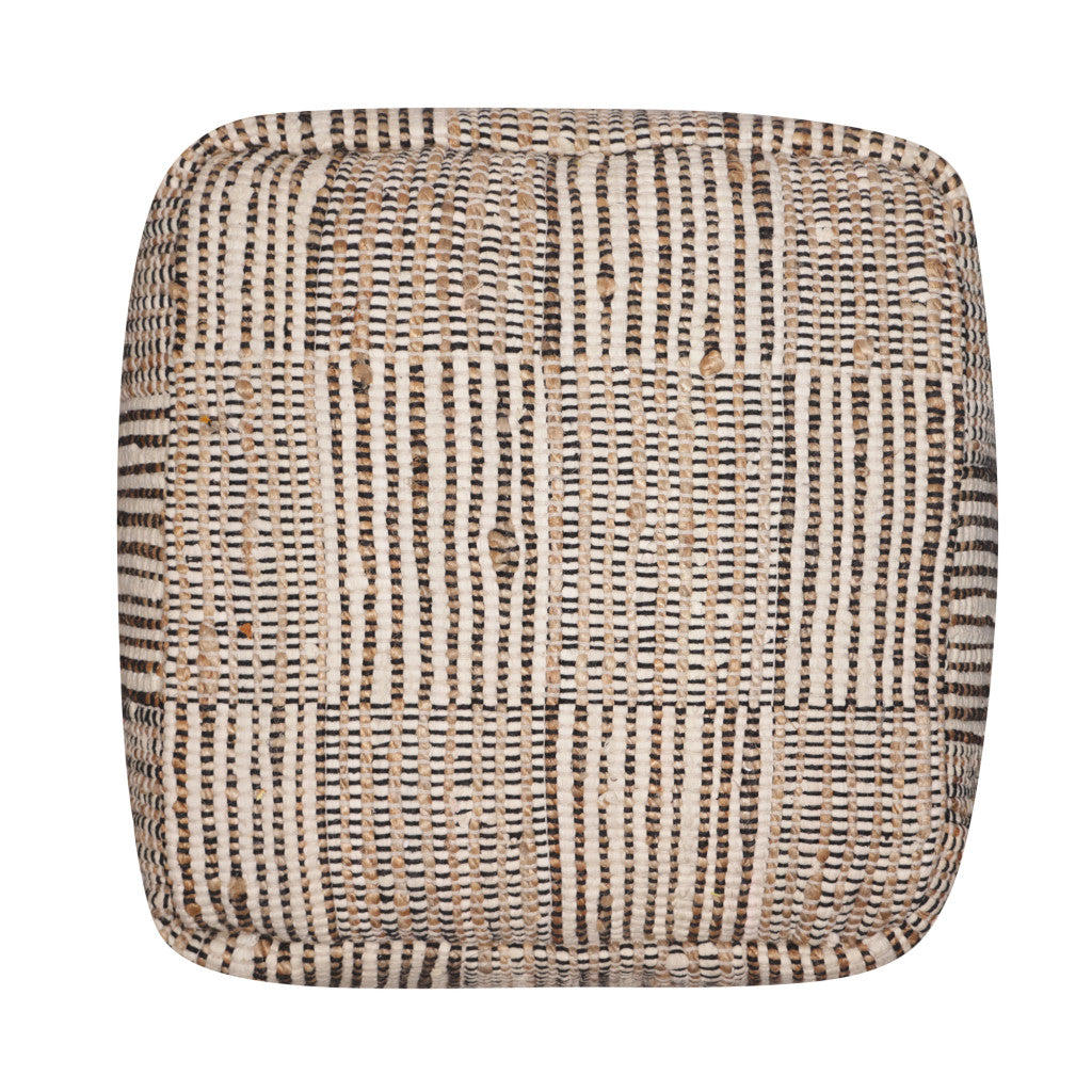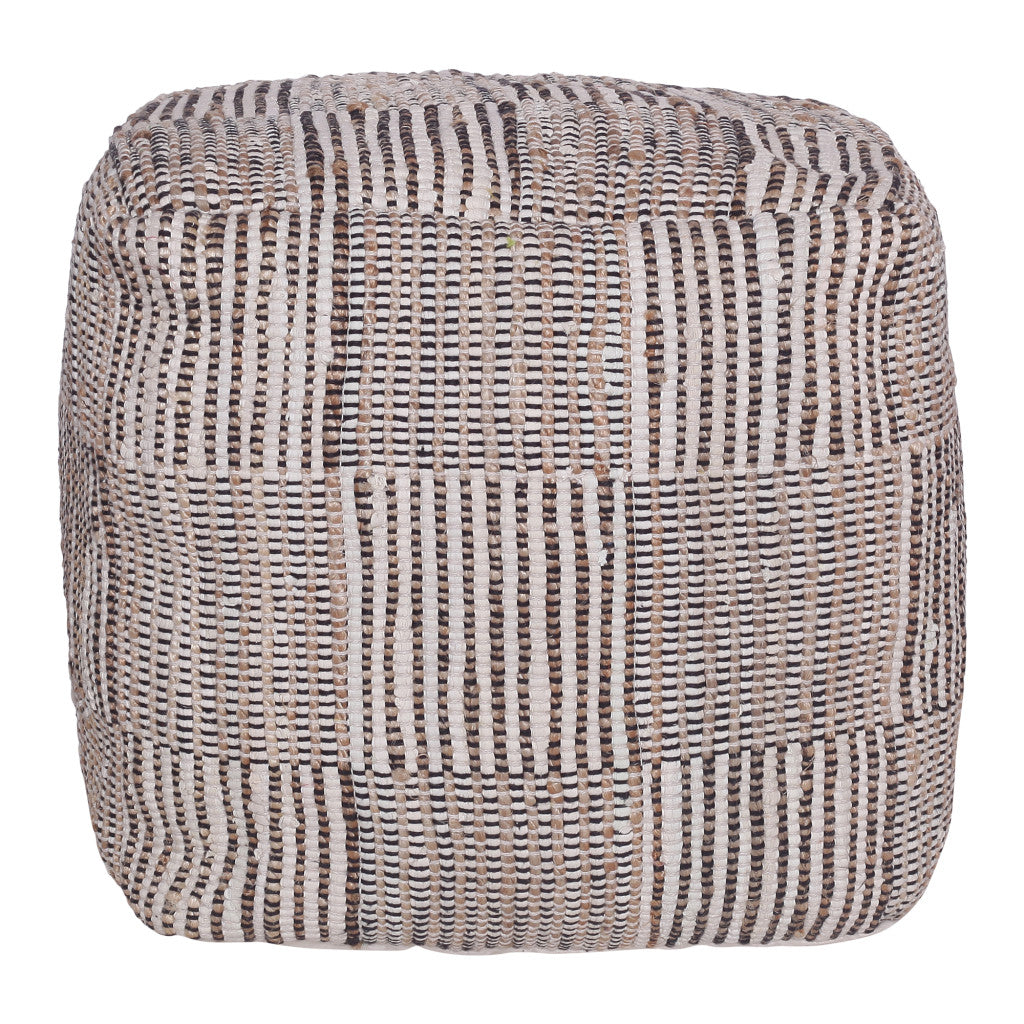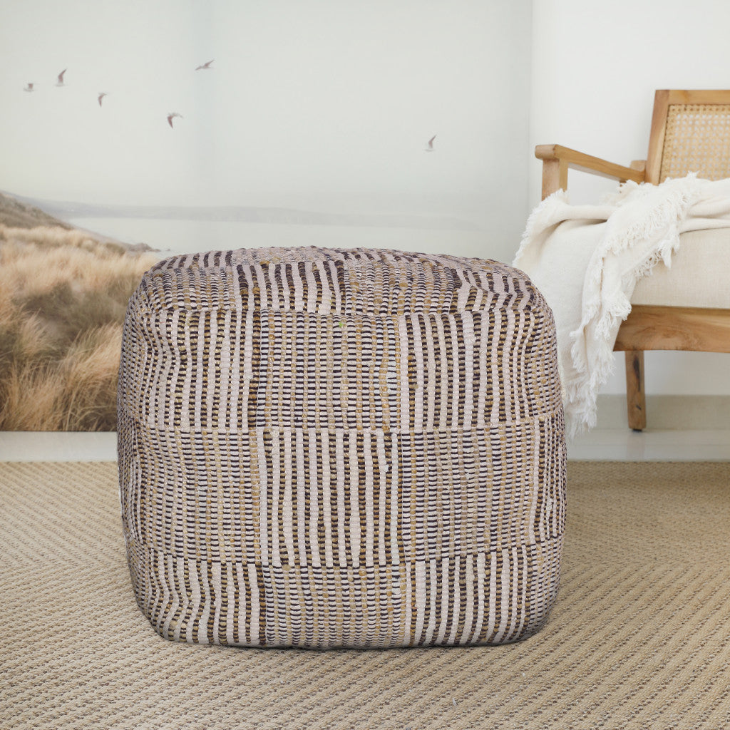 - Cube-shaped ottoman with brown upholstery.