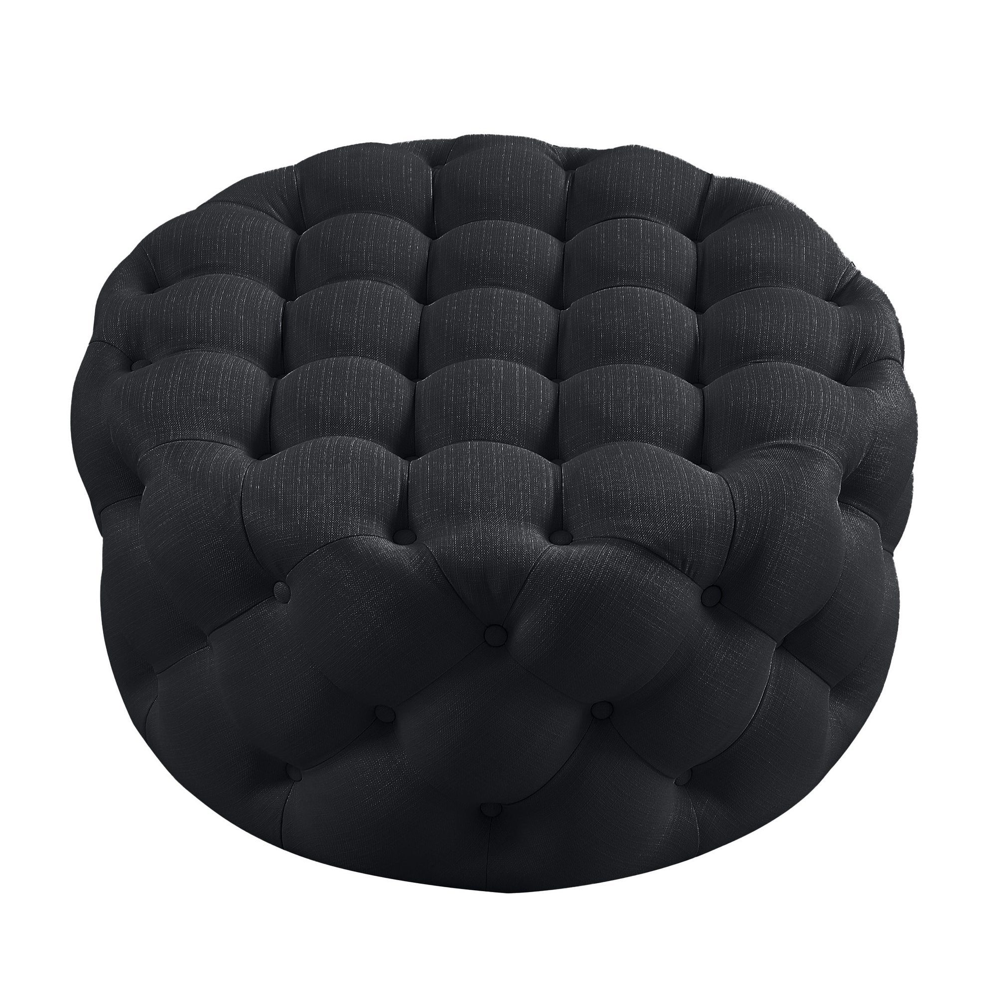 - The round shape and heathered black upholstery give this ottoman a sleek, modern look that complements most decor.