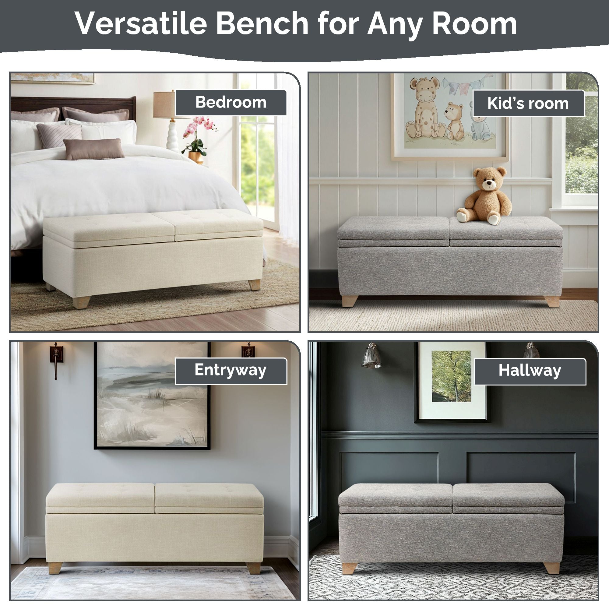 Bring timeless style and practical organization to any room with this elegant dual-compartment storage bench. Its button-tufted upholstered top and thoughtful features combine comfort, safety, and utility—ideal for bedrooms, entryways, or living spaces that need discreet storage without compromising design.