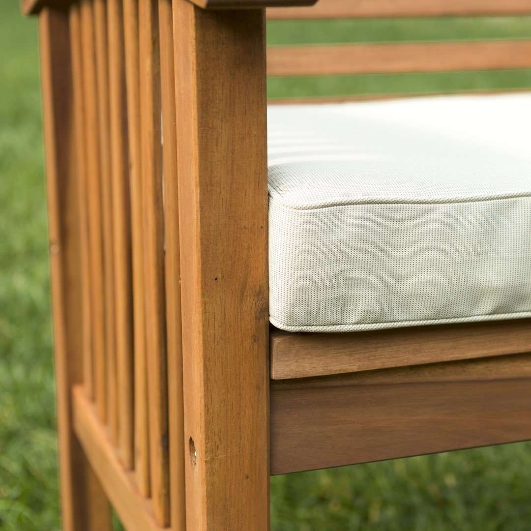 Bring a welcoming touch to any patio or deck with these beautiful wood patio chairs. Constructed from solid acacia hardwood, each slatted chair is naturally sturdy yet stylish. Feature them as a stand-alone piece or with our exclusive dining or conversation sets. Included are two deep-seated chairs with plush, soft seat cushions.