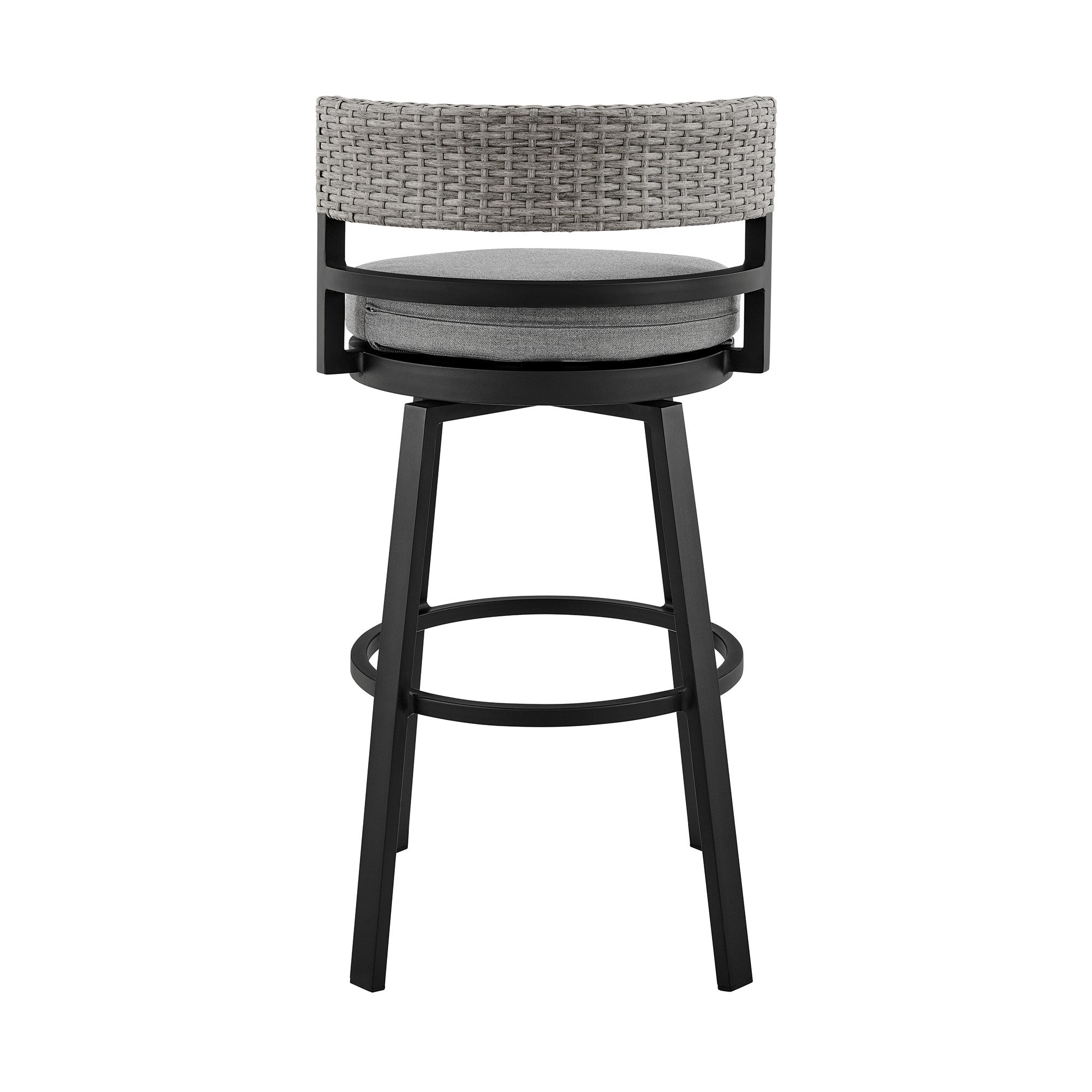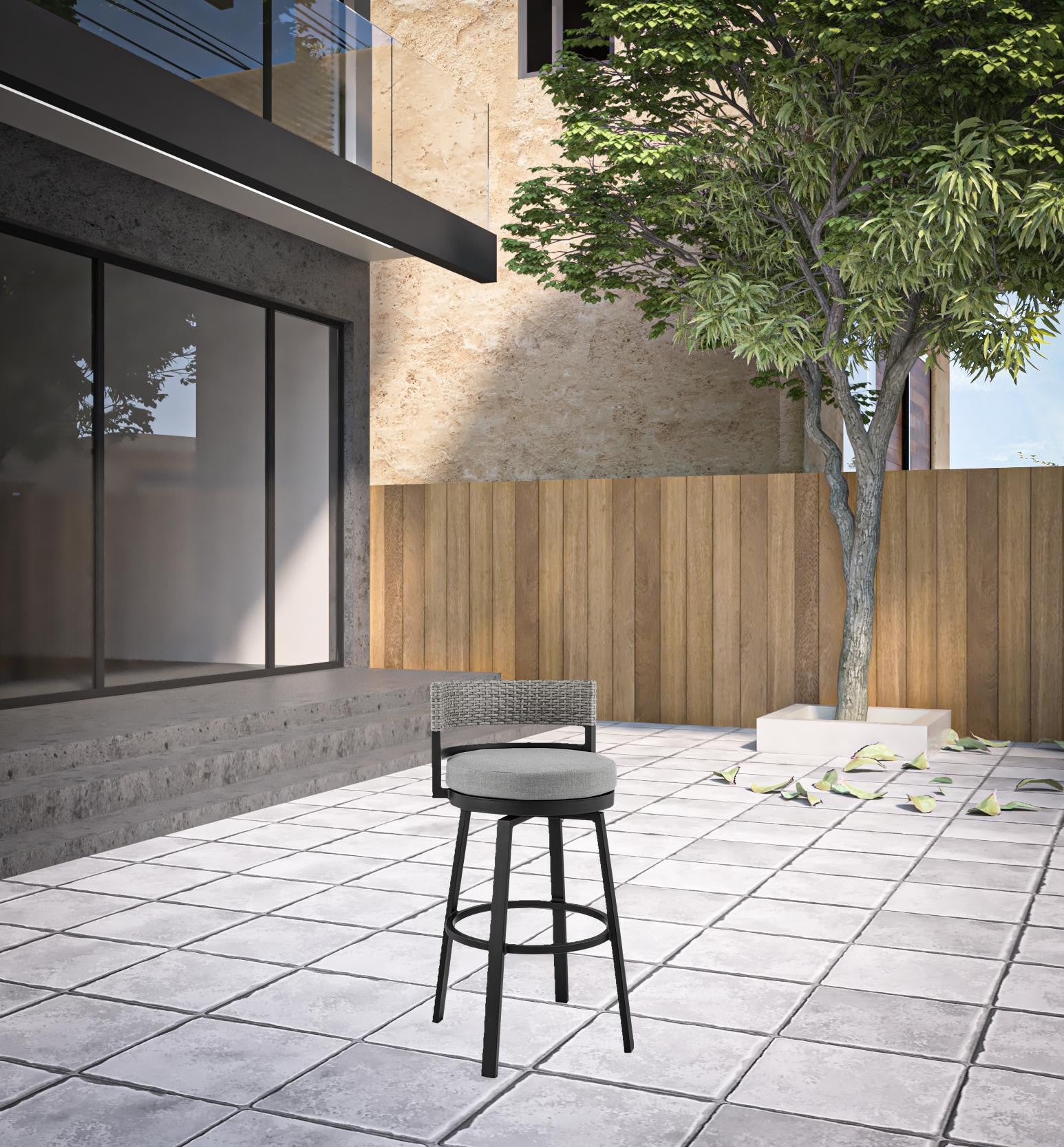 - Upholstered outdoor bar chair in sleek black finish.