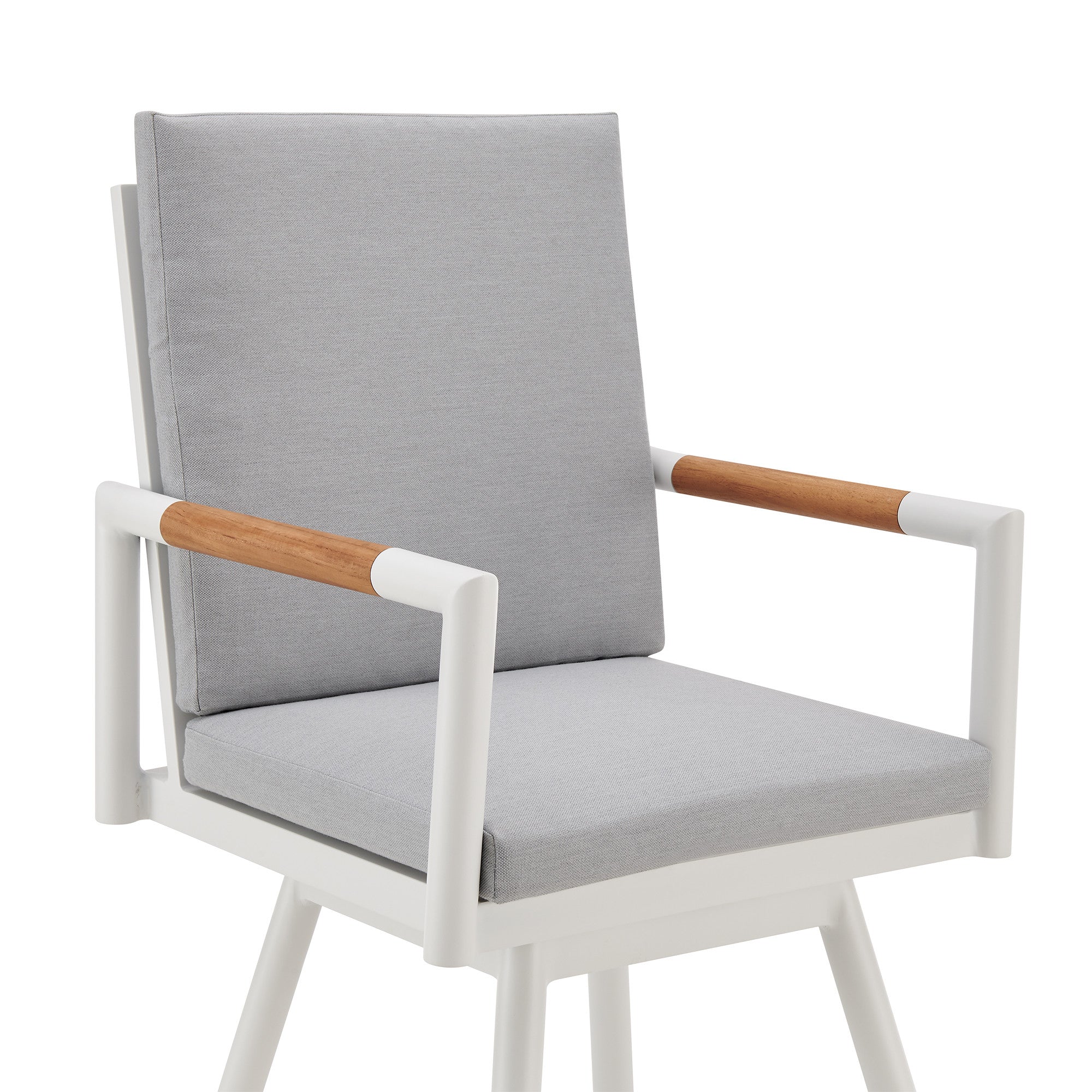 - Stylish outdoor bar chair with a square seat and full back design, featuring a sleek white metal frame and light gray upholstery.