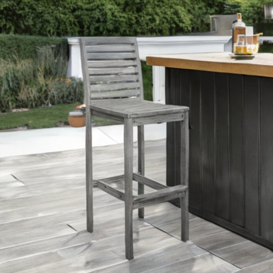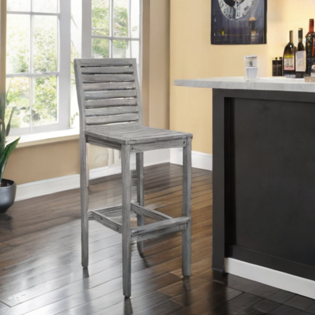 - Rustic weathered gray slat seat bar height bar chair. Suitable for use indoors or outdoors.