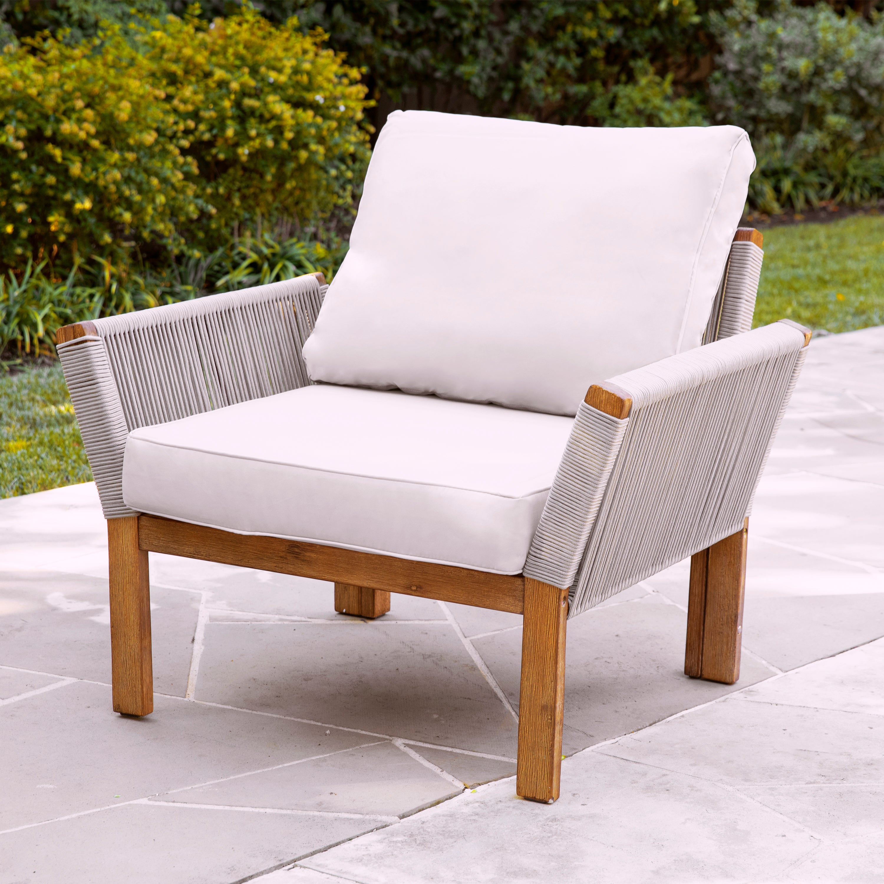 - Finish: Oiled acacia and natural finish w/ white cushions