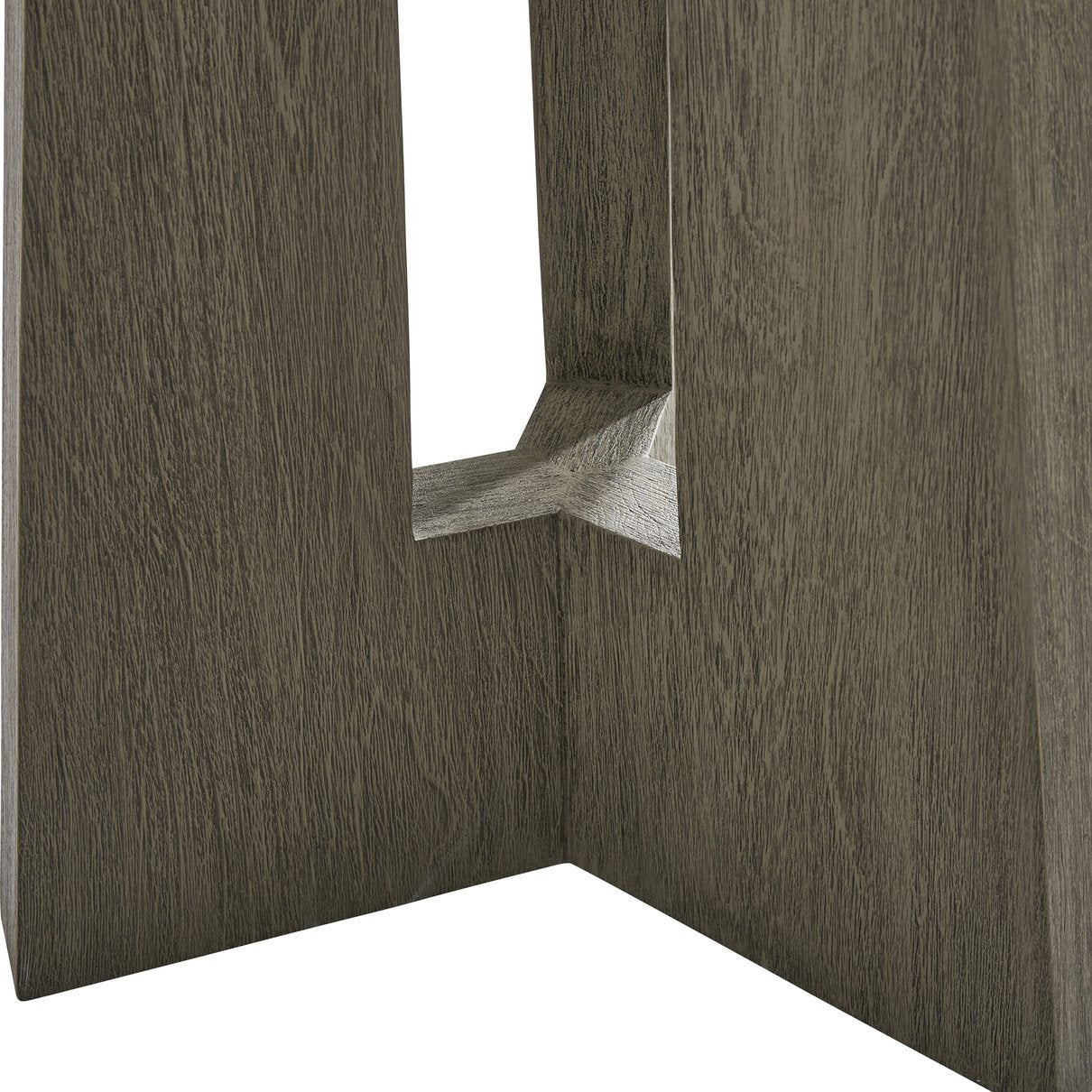 - Base: Three teak leg panels with open centers intersect to form a sculptural support that allows light and sightlines to pass through.