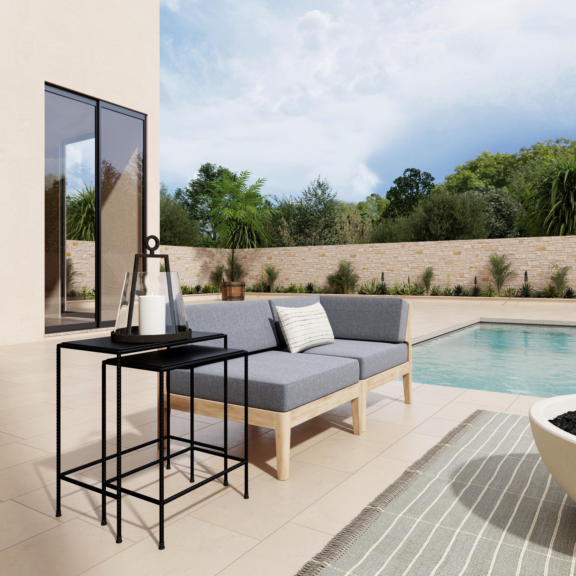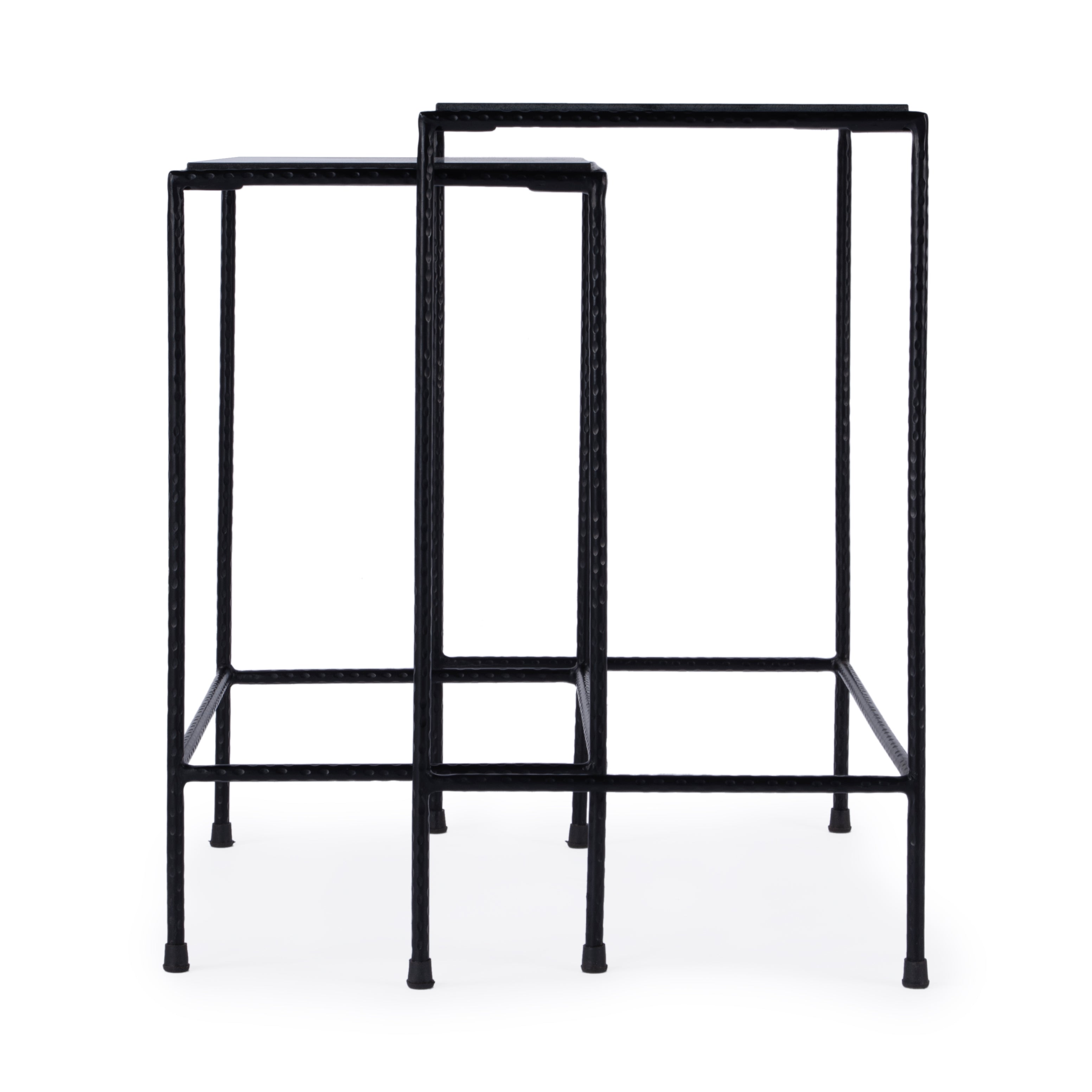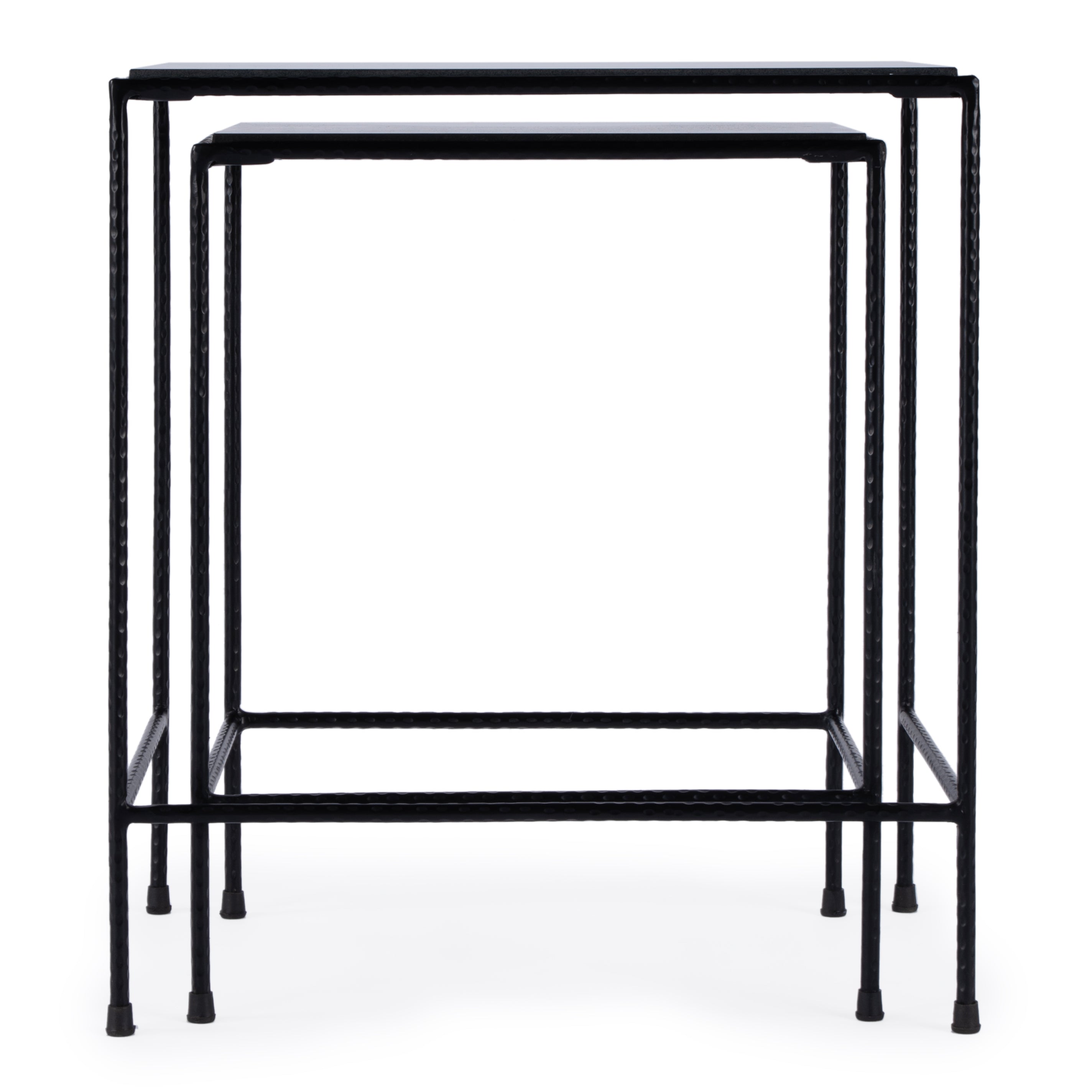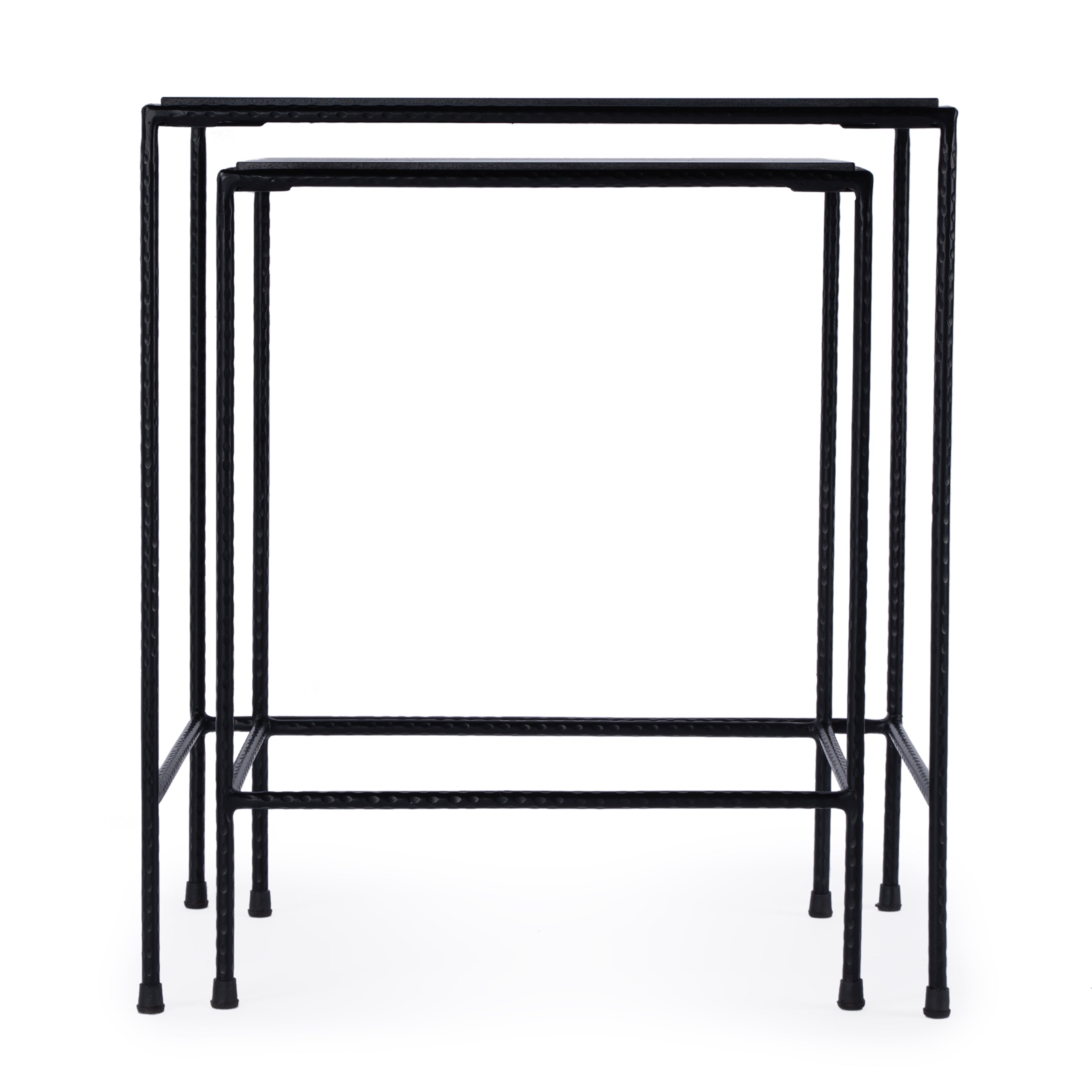 - Large table features missing lower support rail to allow nesting smaller table underneath