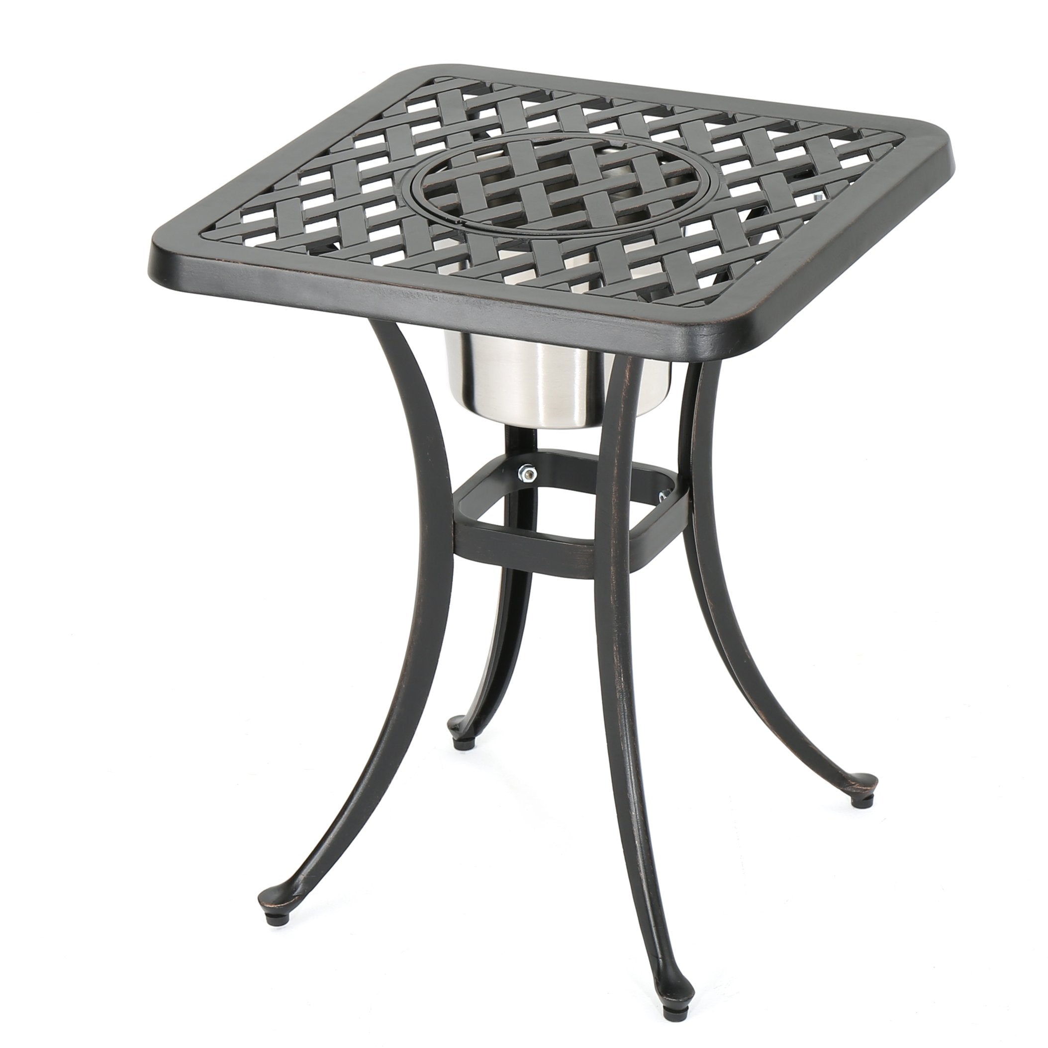Bring refreshing functionality and classic bistro style to your outdoor living area with this compact, weather-ready table featuring a built-in ice bucket. Perfect for patios, balconies, or garden nooks, its aluminum construction and copper-black finish combine durability with elegant, timeless detailing — flared legs and a weave-inspired top — to create a versatile focal point for intimate gatherings or quiet afternoons outside.