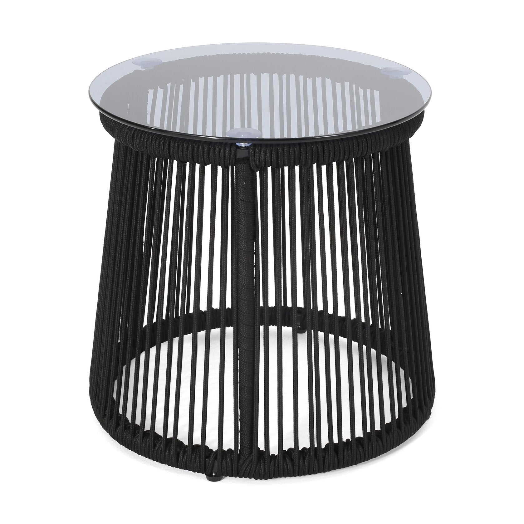 - Embrace the summer by sharing a chilled drink with a friend over a convenient companion to your favorite seating set. Featuring a delightful hand-wrapped rope design, our side table offers a durable structure and uniquely modern style. Consisting of the drum-shaped frame, this charming piece is made to last with its sturdy yet stylish construction. Finished with a stunning tempered glass top, you can easily enjoy a warm sunny day outdoors with a glass of lemonade and a bowl of your favorite snac