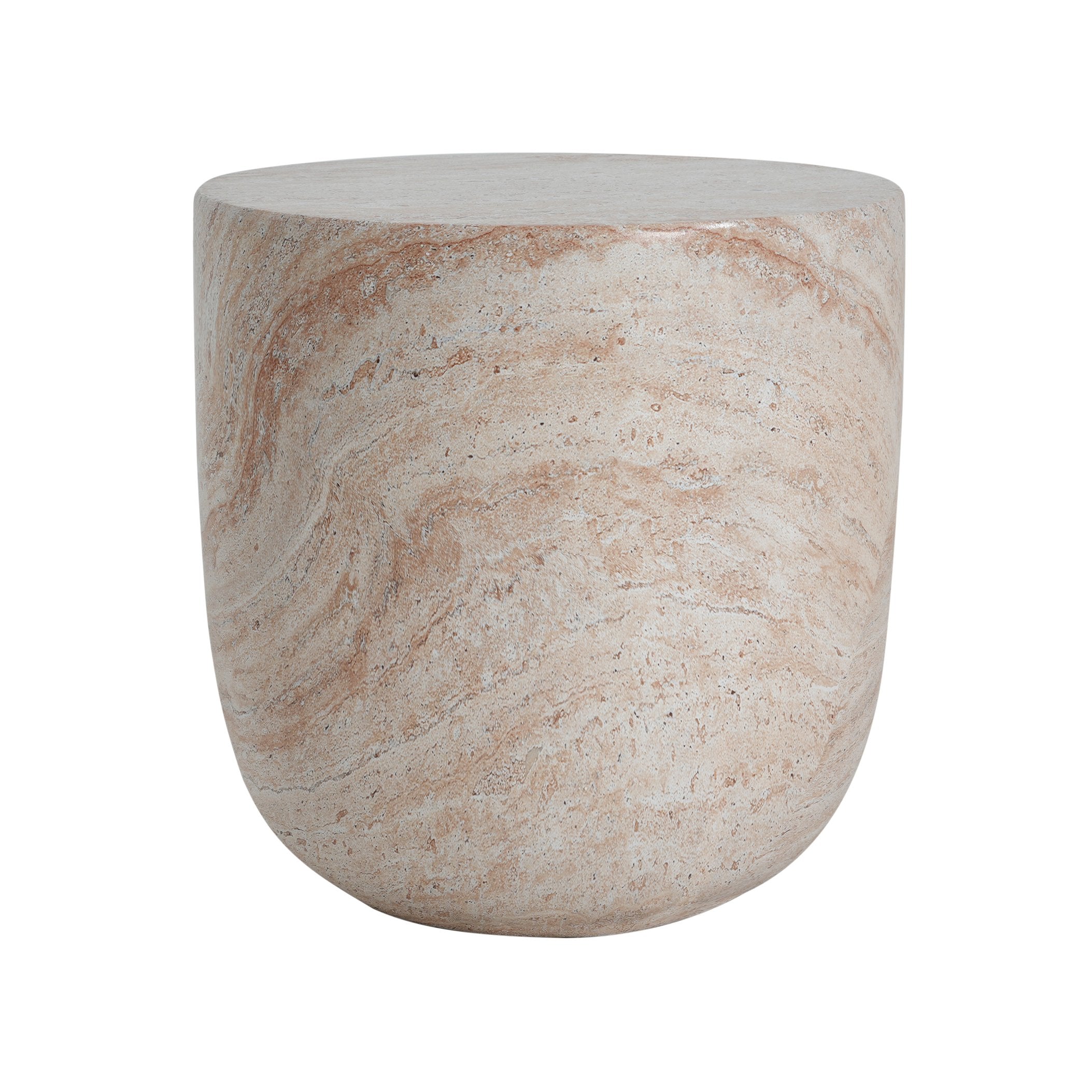Bring a touch of natural elegance to your indoor or outdoor living areas with this lightweight concrete side table finished in a warm travertine tone. Its graceful barrel silhouette and textured surface create a refined focal point that works equally well as a side table, occasional stool, or decorative pedestal — no assembly required.
